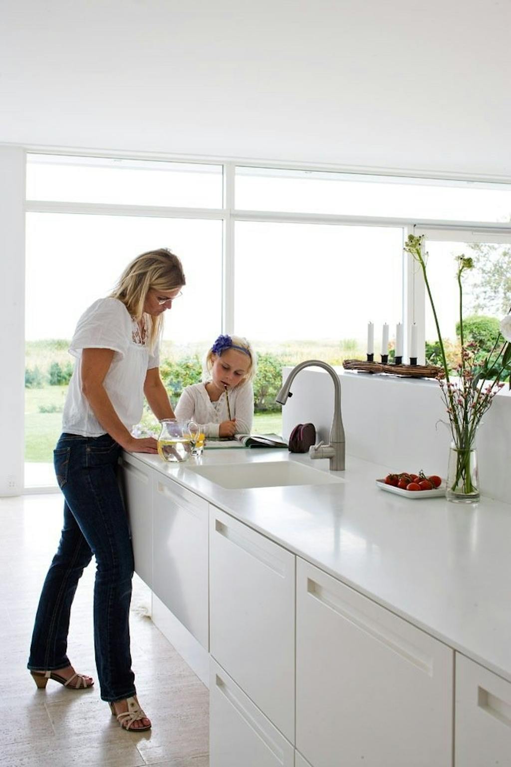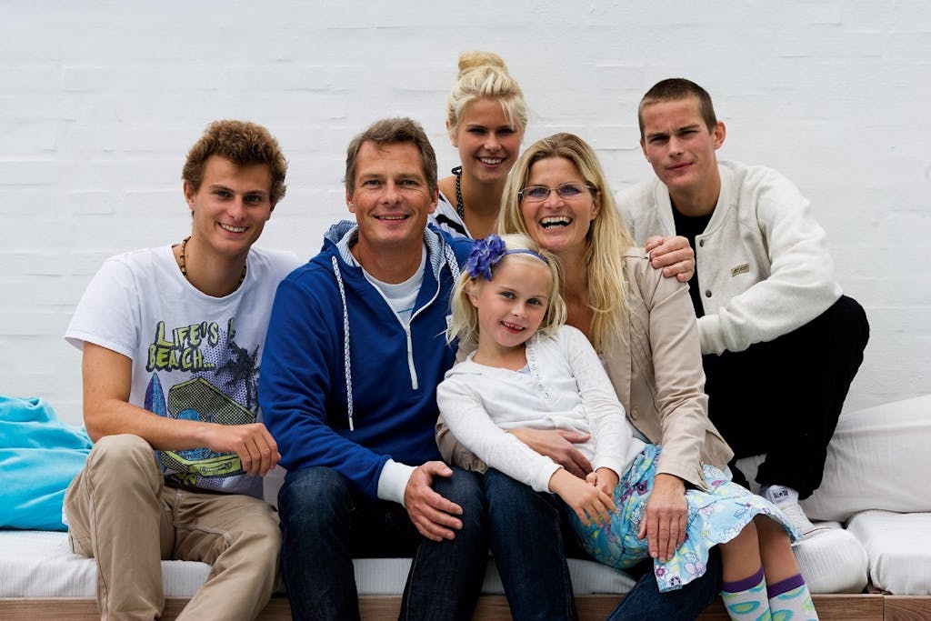 Mai-britt Hou-Vangsaae, arkitekt med egen tegnestue, Kristian Reseke, salgschef og investor, og børnene Simon på 19 år, Philip på 18 år, Birgitte på 15 år, Liv på 8 år og hunden Smilla.