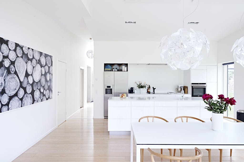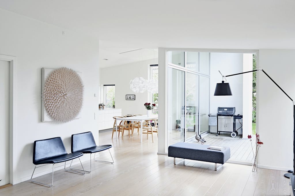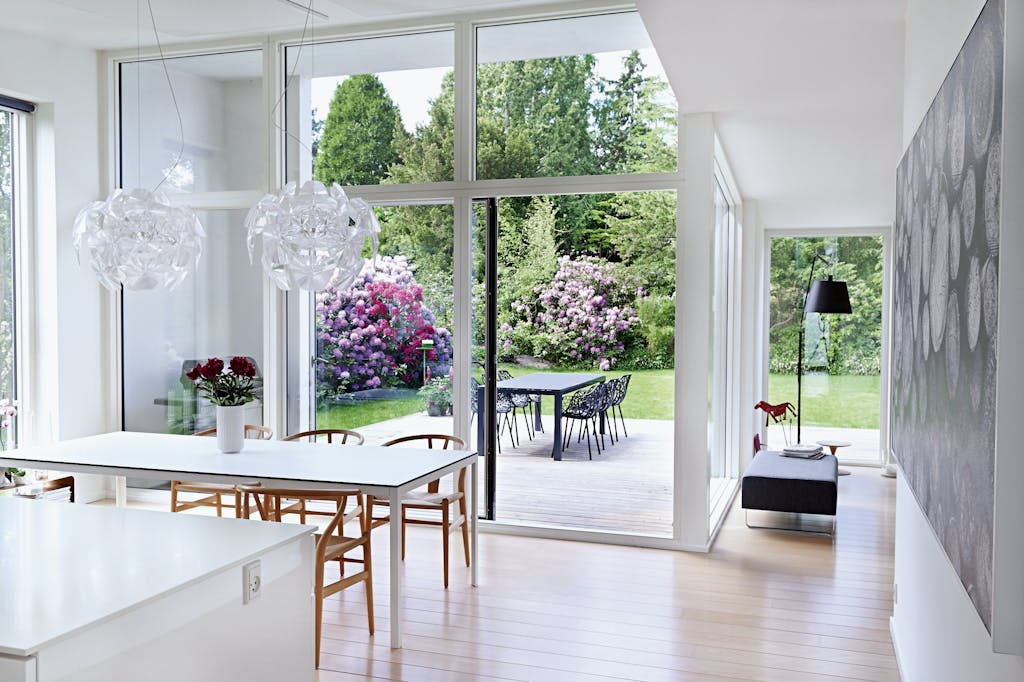 Husets forskudte dele gør, at køkken og spiseplads hænger sammen med opholdsstuen, men alligevel er adskilt. Andeparret på terrassen kom forbi og gik faktisk helt ind i huset, da vi var på besøg. Stole fra Paustian. Kunstværket er et lyddæmpende vægpanel af Anne Kyyrö Quinn. Gulvlampen er enTolomeo Mega fra Artemide.