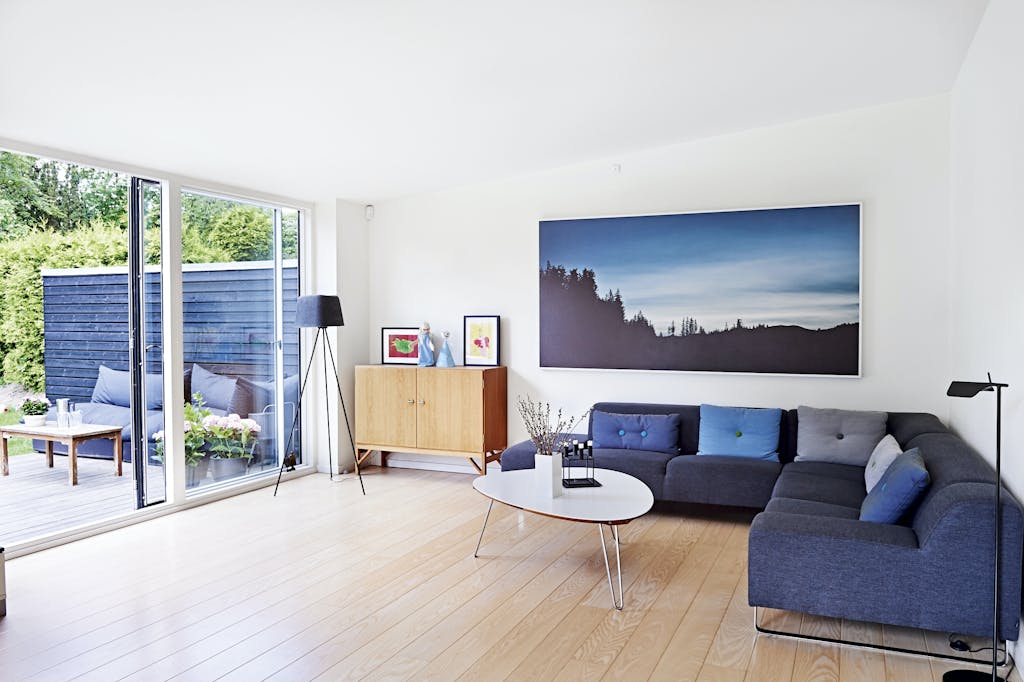 Stuens sofahjørne fortsætter ud på terrassen, der er indrettet med loungemøbler fra Karmameju. Sofaen er fra Bolia, og bordet fra Naver Collection. Skænk af Børge Mogensen og lampe fra Tom Dixon. Maleriet er endnu et stykke lyddæmpende kunst.