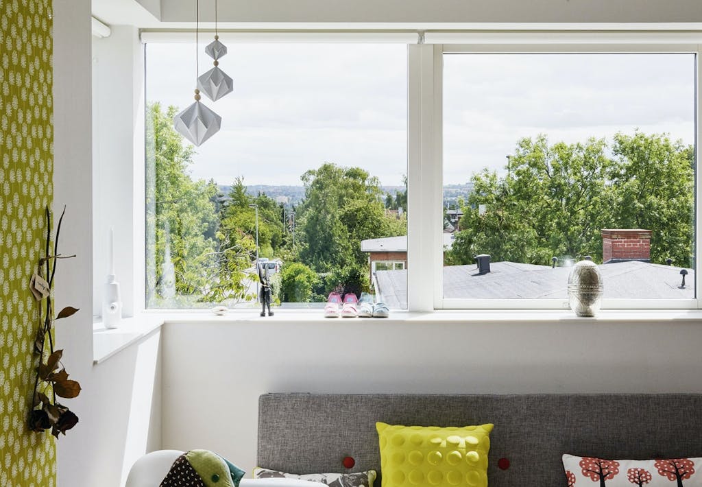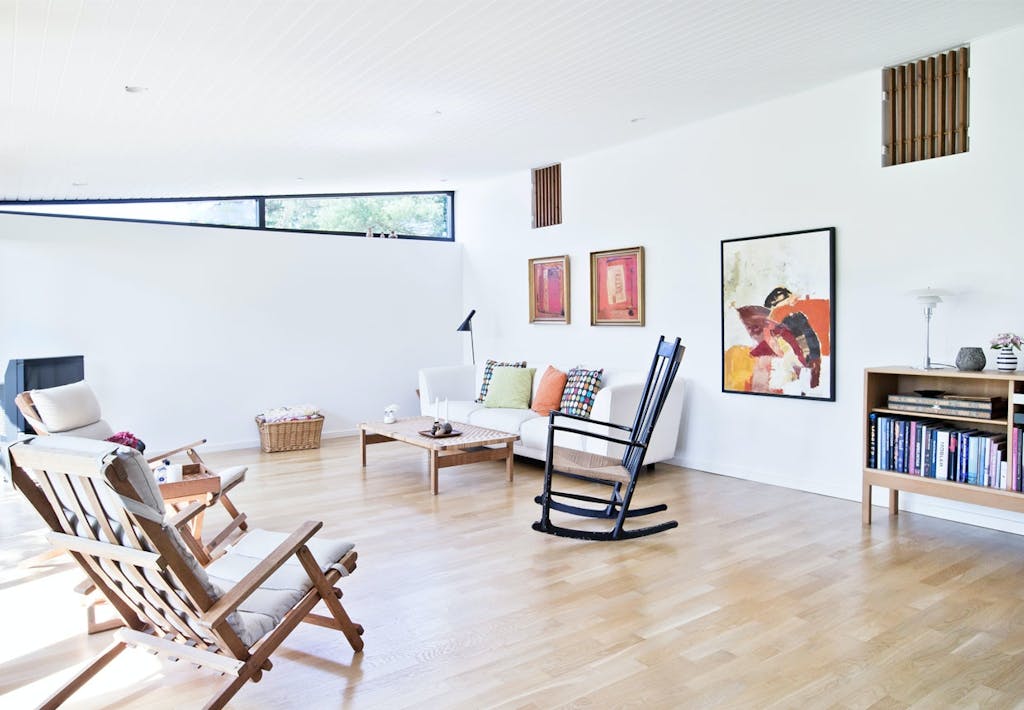 I stuen er de oprindelige parketgulve udskiftet med nye og de gamle radiatorer under vinduerne er fjernet og erstattet med gulvvarme. Det har givet mulighed for at lave et nyt vinduesparti, der spænder fra gulv til loft.