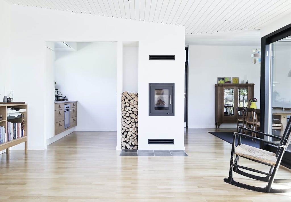 Køkkenet er åbnet op ud til stuen og alrummet på den anden side af pejsen. Den løsning har givet mere lys og gjort køkkenet til et centralt rum i huset. Elementerne af eg er specialfremstillet af Køkkenskaberne.