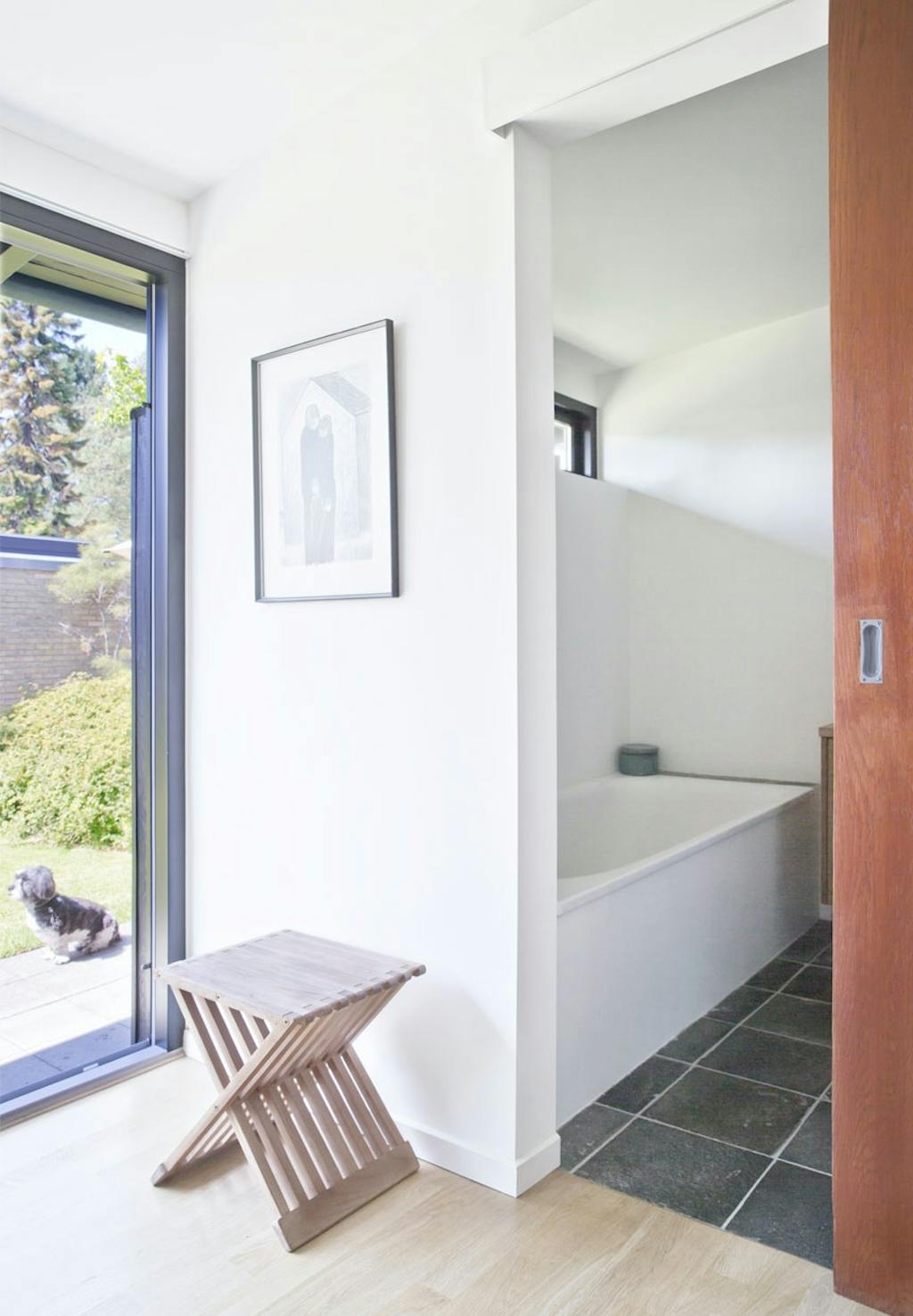 Soveværelset har fået store skydedøre ud til haven og direkte indgang til det nye voksenbad. Skydedøren er genbrug fra husets tidligere gangareal. De rustikke grågrønne skifferfliser lå oprindeligt i indgangspartiet.