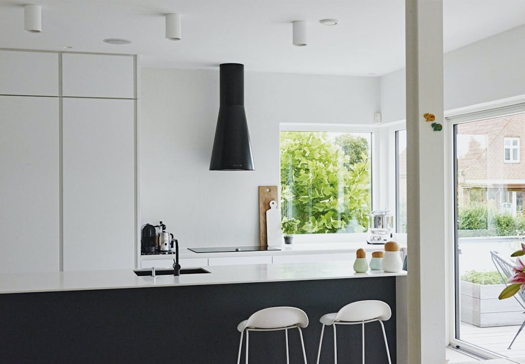 Køkkenet er holdt i sort og hvidt, og har udgang til en lille morgenterrasse.