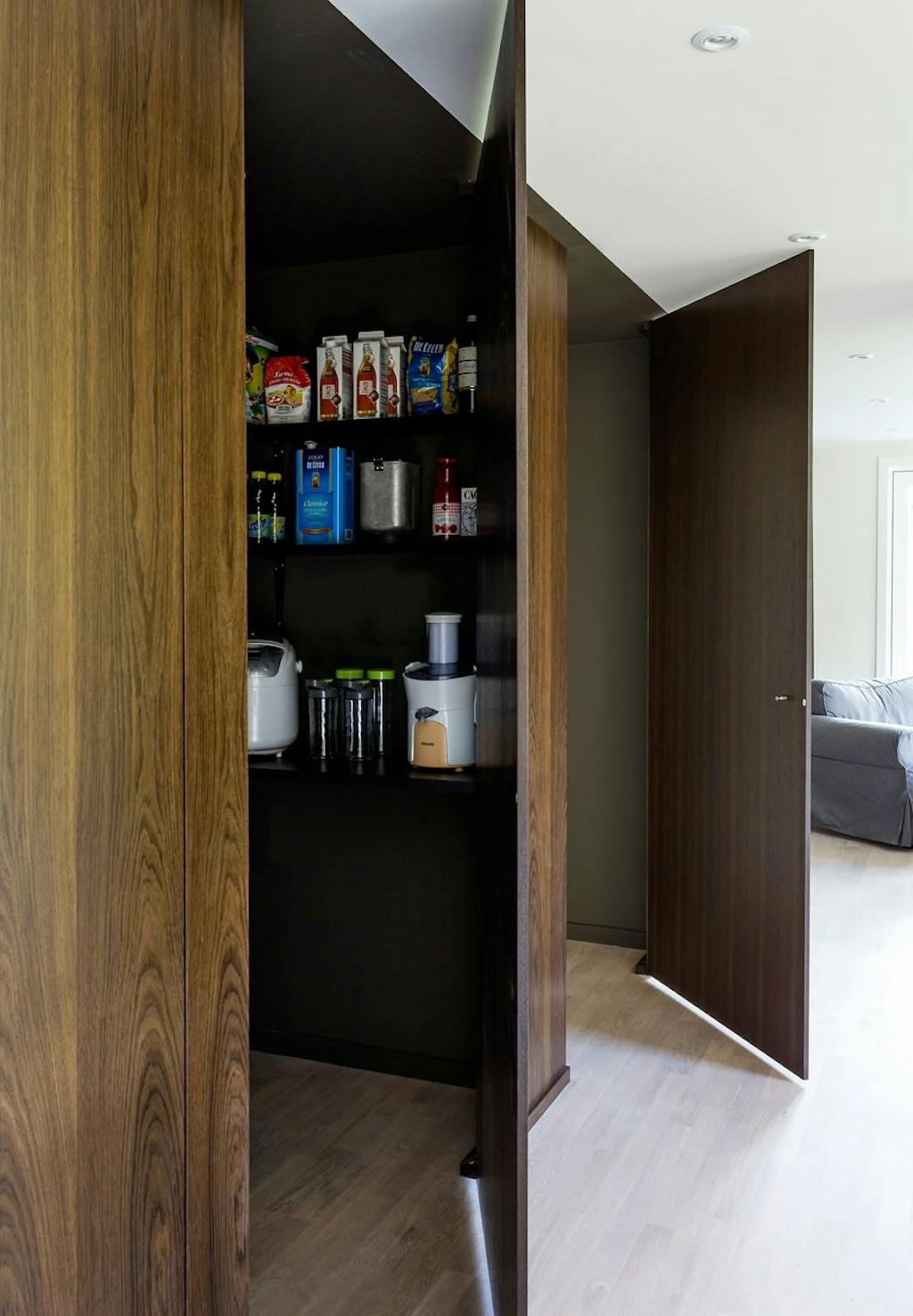 En lang skabsvæg i røget eg fungerer som en ryg i køkkenet. Bag nogle af trædørene gemme sig bl.a. viktualierum, køleskab, og skab til køkkenmaskiner.