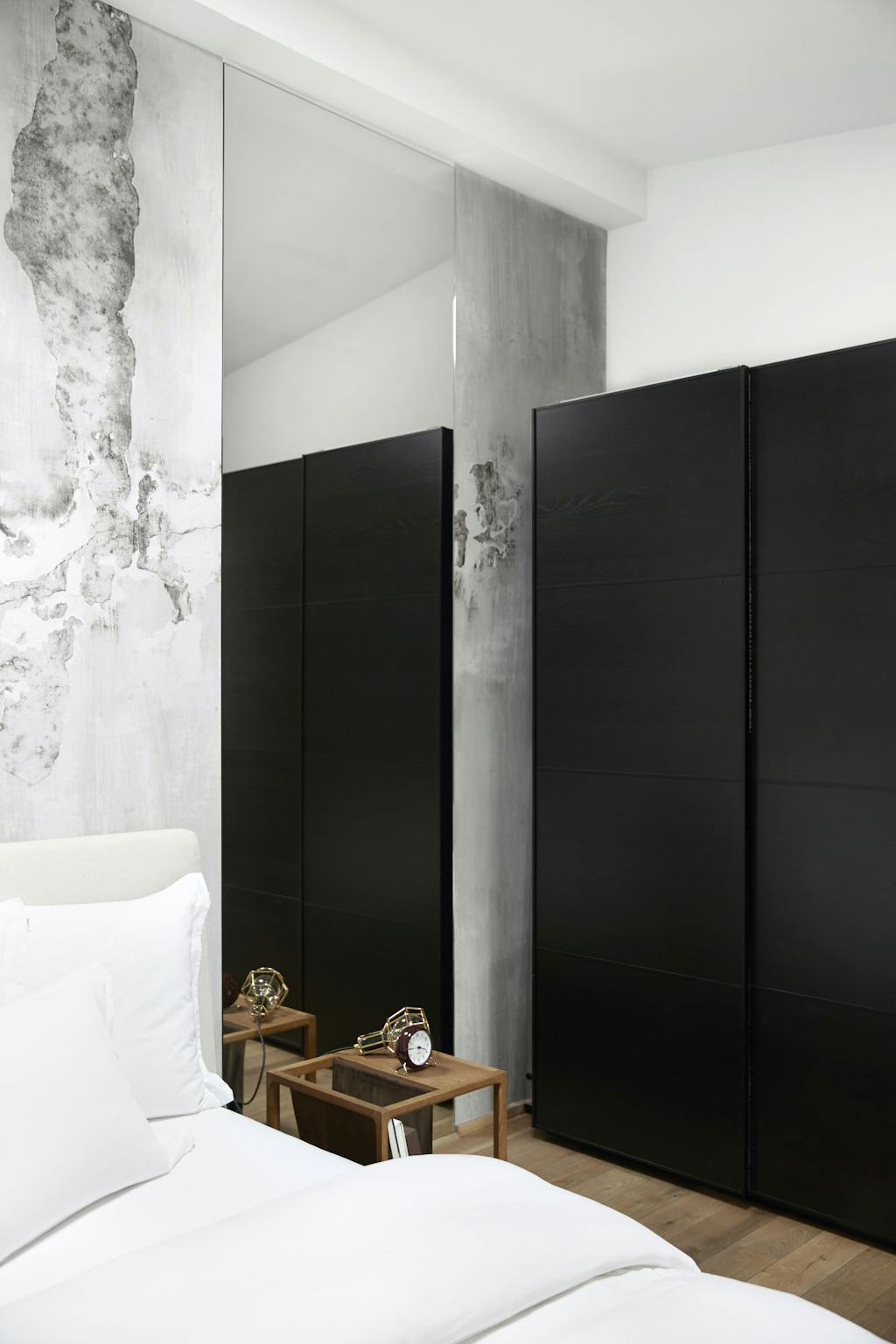 Soveværelsets seng er fra Ikea, og bag ses et tapet fra Mandrup Poulsen, som illuderer beton i forfald. Et loftsvindue giver skylight, men kan lukkes af med et gardin. Det lille sengebord er fundet hos Roxy Antik, herpå står et vækkeur af Arne Jacobsen for Rosendahl Timepieces.