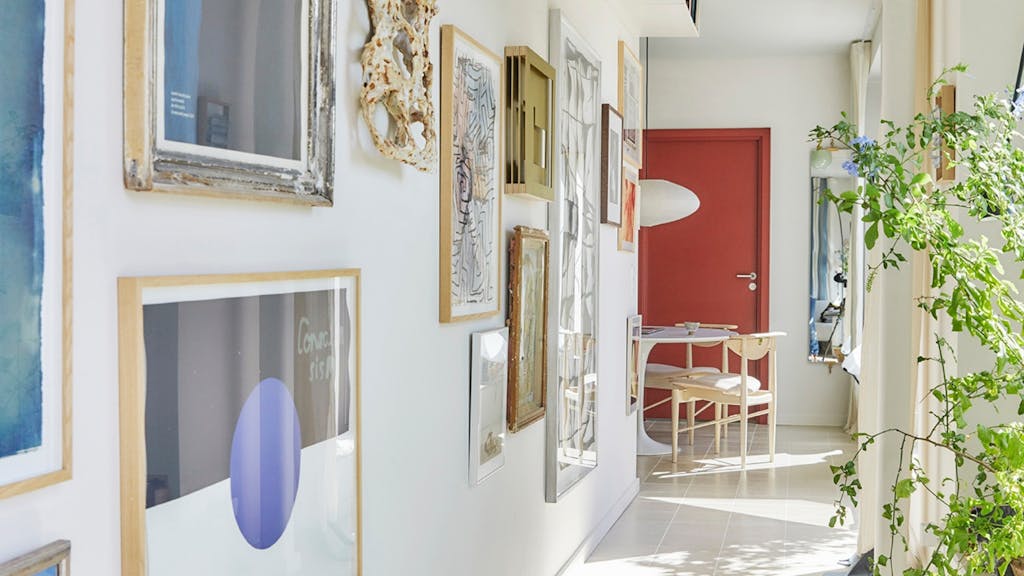 Et centralt valg var at inddrage et større gangareal som kunstgalleri. Hele væggen ud mod vinduerne er fyldt med kunst, samlet gennem årene. Ved at skabe en bro mellem køkken-alrum og stuen i den anden ende har de bragt en ekstra funktion ind i rummet. Desuden understreger det, at kunsten betyder ekstremt meget for hende.