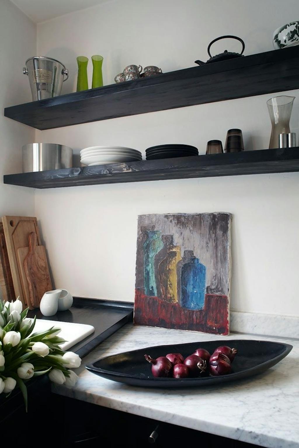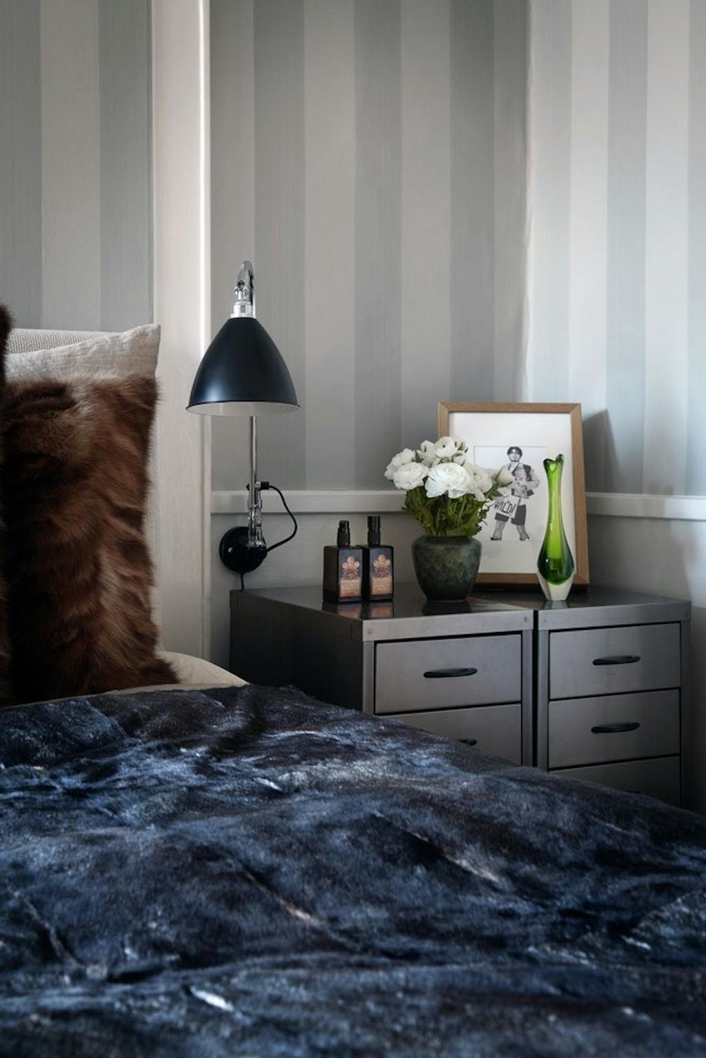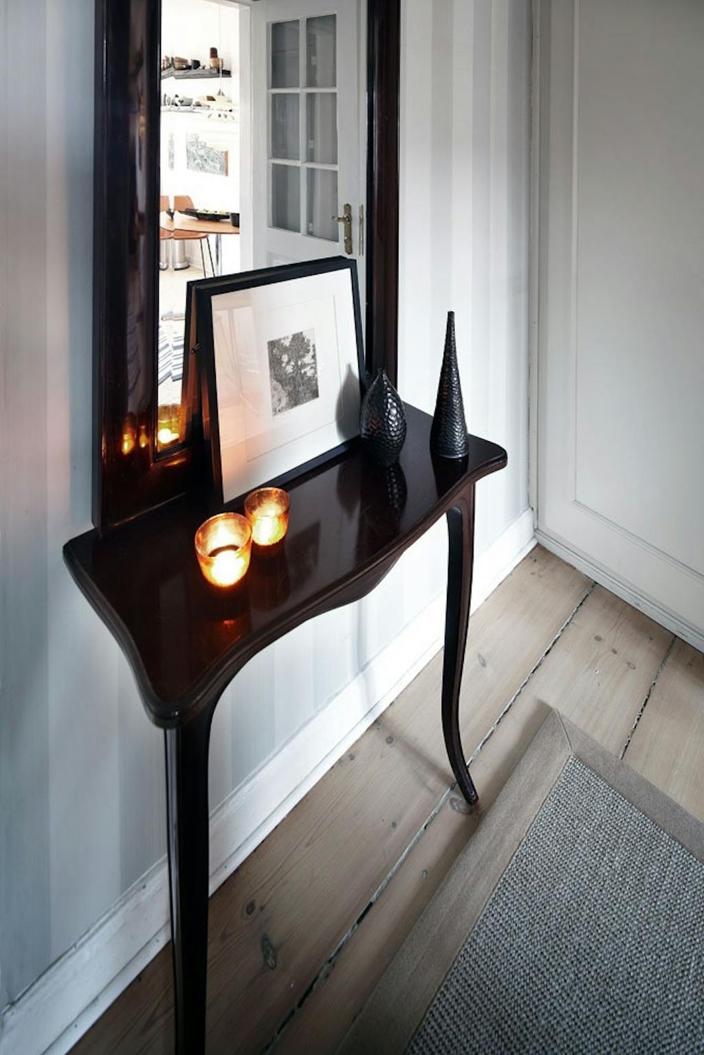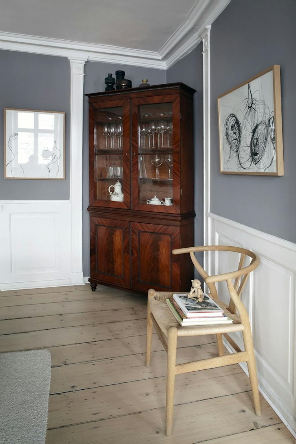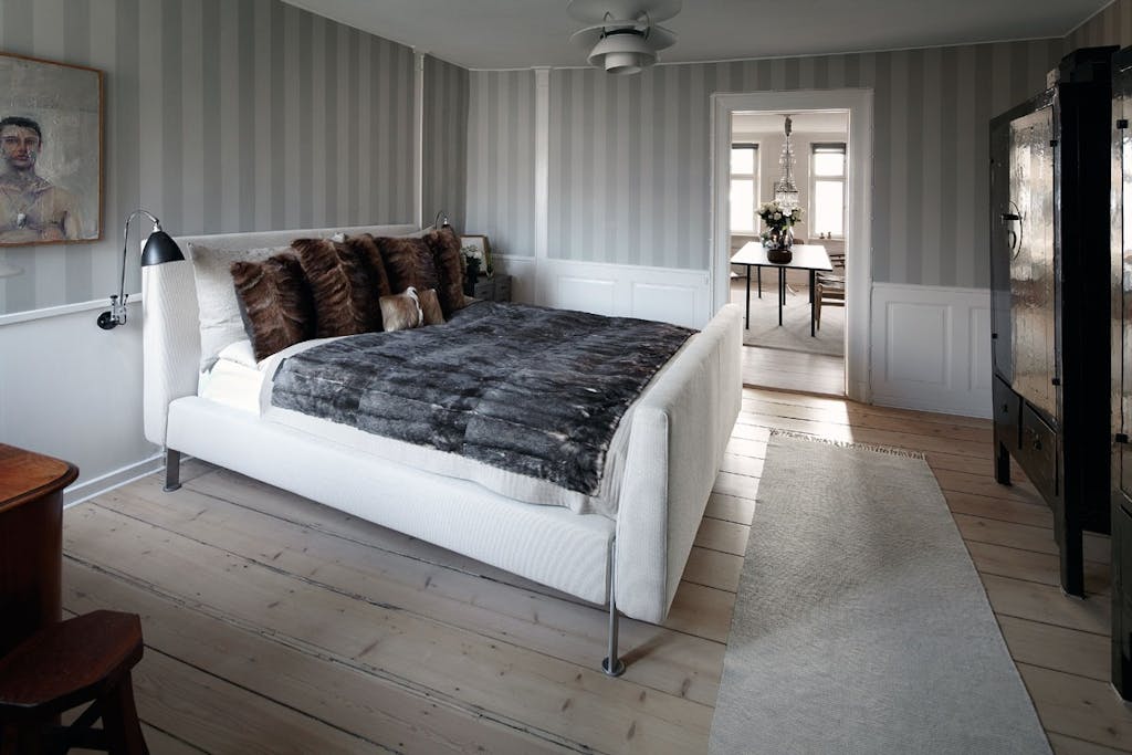 Farverig kan man til gengæld ikke kalde hans hjem. Derimod er den farvekonsekvent. Gråtoner, jordfarver og sort med lidt okkergullige anstrøg hist og pist og med hvide paneler, døre og lyse løse tæpper som basis.