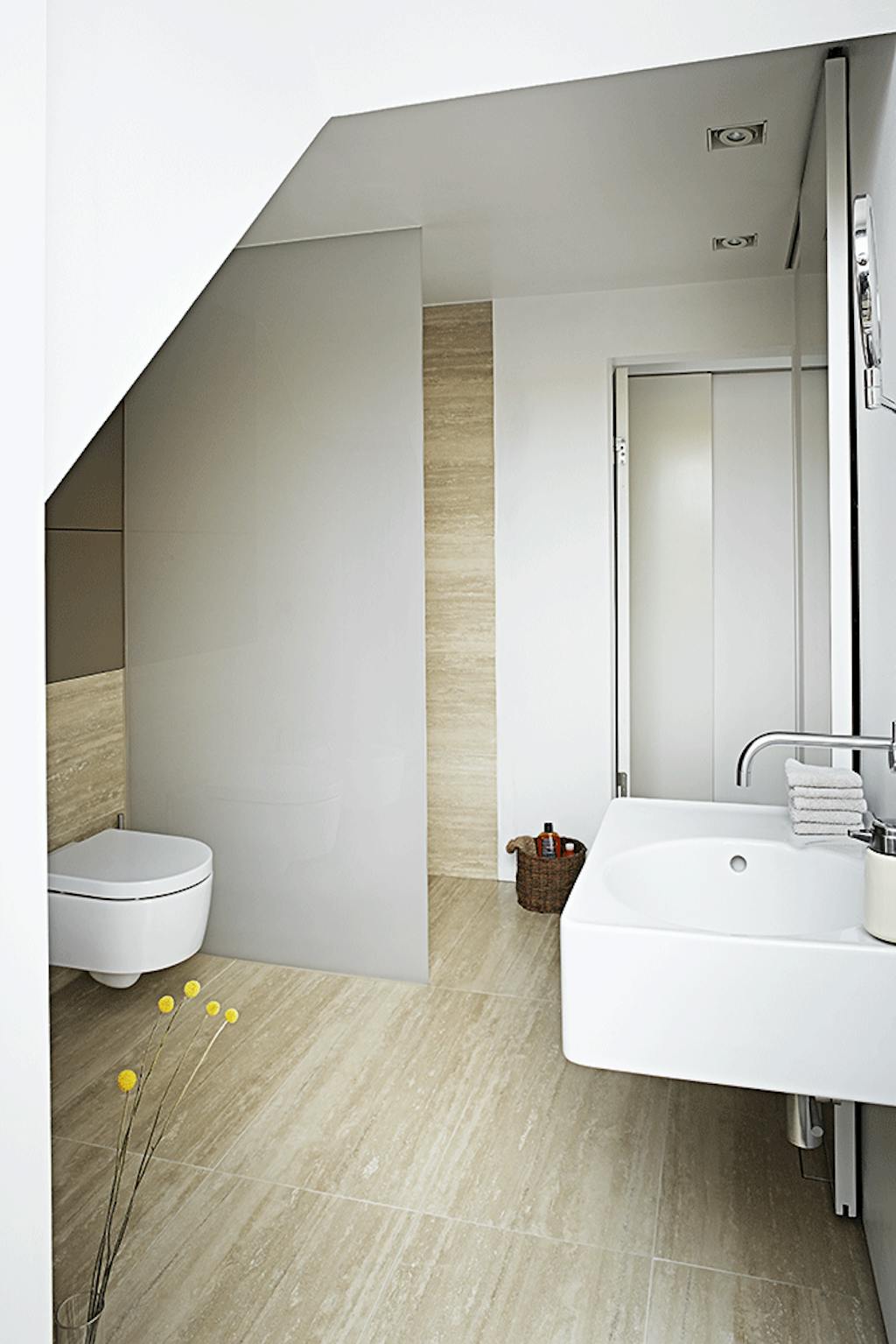 Badeværelset er holdt i bløde, dæmpede farver. Hotelstilen er gennemført. Og det er intet standard over noget herude. Alt er specialtegnet hertil. På gulvet og væggene er cremefarvet italiensk travertin skåret i specialformater. Og Lars Vejen har selv båret alle fliserne op på femte sal. De forskellige, oprindeligt hvide, håndklæder har han farvet i vaskemaskinen, så de changerer i samme farveskala. Pilekurven har Lars Vejen selv flettet. Bemærk den smarte løsning: Håndklæder i kroge skærmer for vaskemaskine og tørretumler.