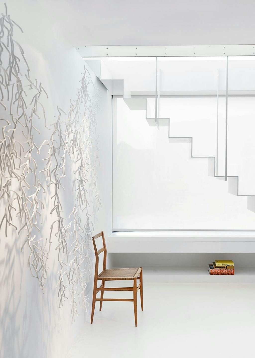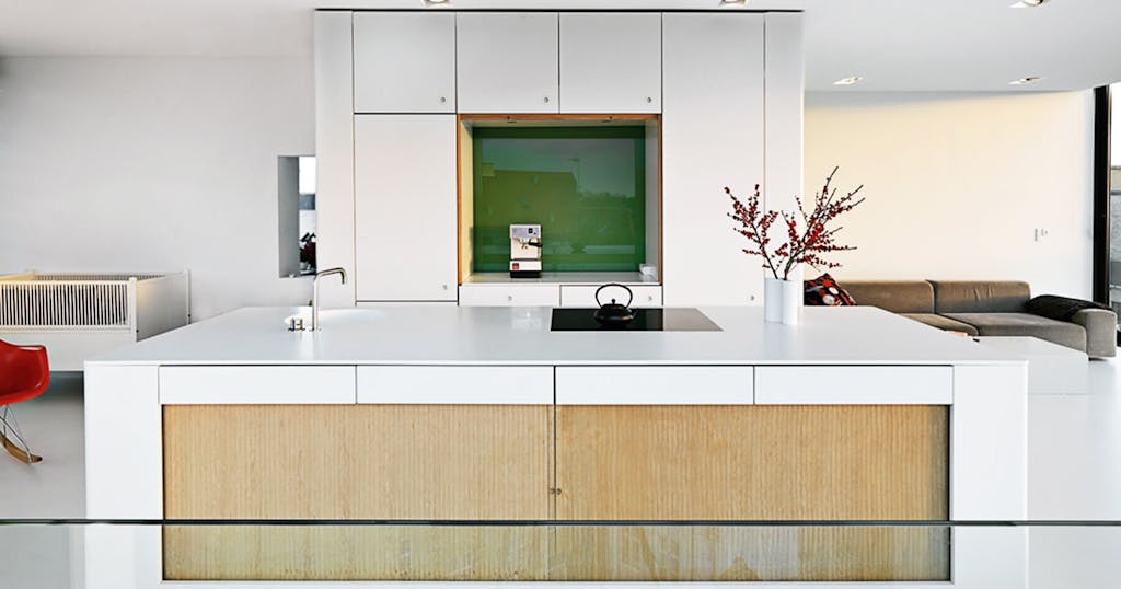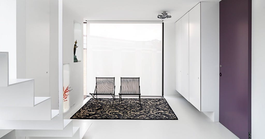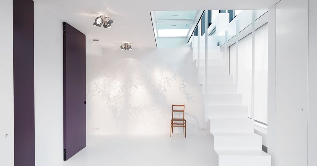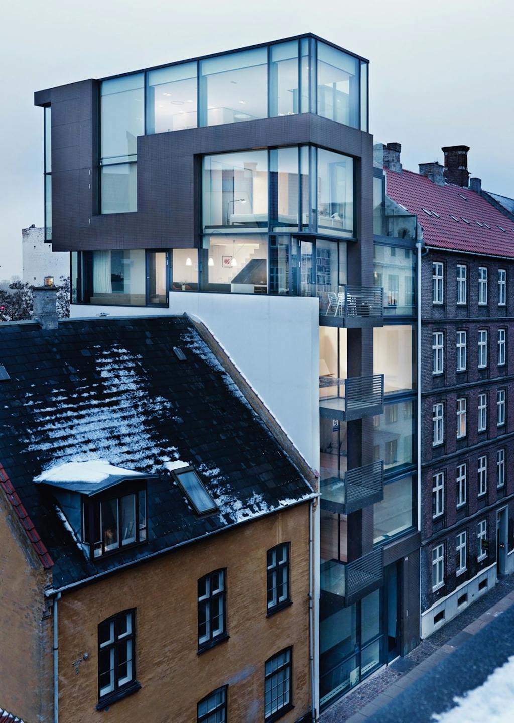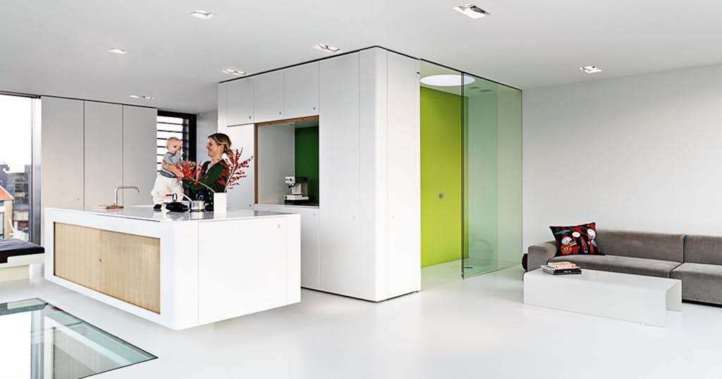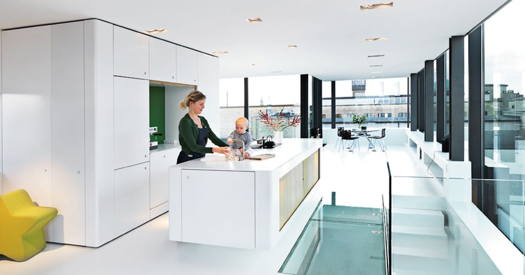 På toppen (5. og 6. sal) af det prisbelønnede hus bor Stine og Nils Holscher med tre små børn og en enkel, stram og minimalistisk stil.