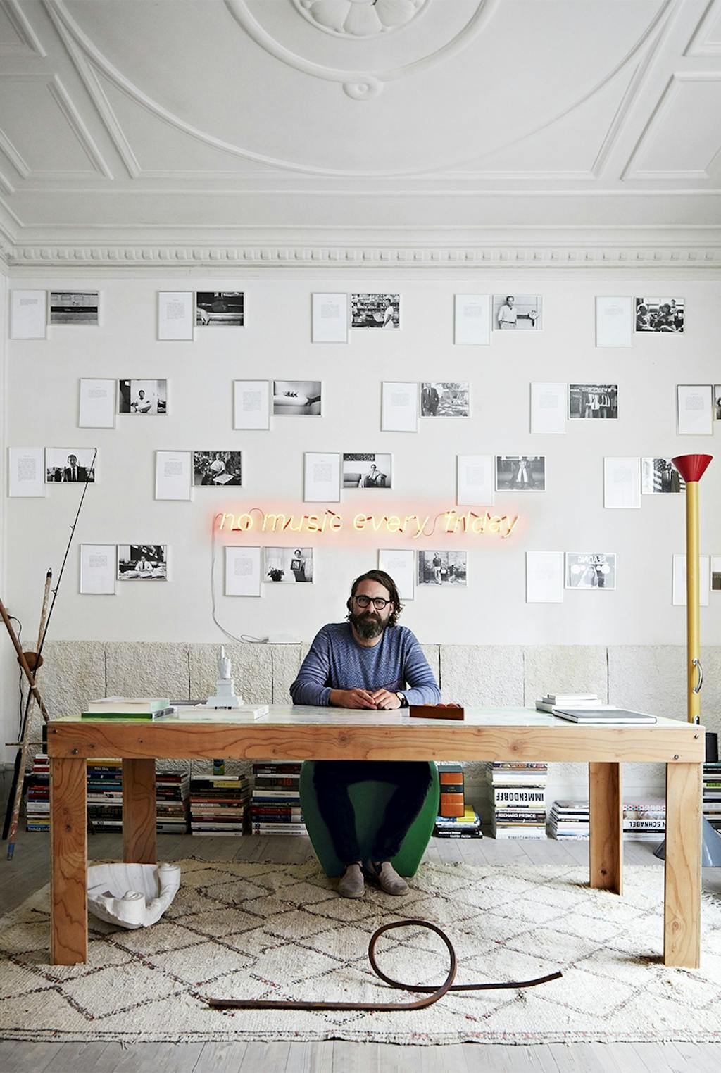 Peter Amby er omringet af kunst på sit kontor. Bordet af Jo Nagasaka har stået på hans ønskeliste i flere år. Han prøvede endda at lave et med neonbordplade selv, før det originale stod i hans lejlighed. På endevæggen hænger fotos og tekster, der tilsammen udgør værket Los Angeles af Sophie Calle, som under OL i 1984 spurgte 20 mennesker, hvor englene var. Lyskunsten No music every friday er lavet af den danske kunstner Ulrik Weck, mens Mathias & Mathias står bag skulpturerne under bordet og panelerne, der løber gennem hele lejligheden.