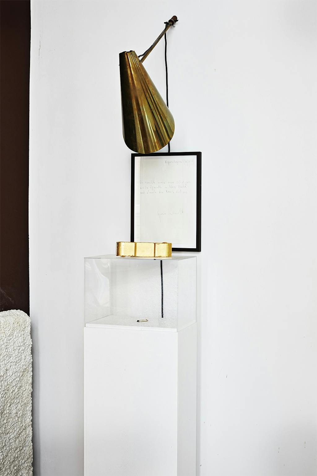 Gregor hildebrandt står bag det udstillede cigaretskod og den tilhørende note, der forklarer, at det egentlige værk var røgen fra denne cigaret. Værket er tænkt som en joke – eller en intellektuel øvelse. For hvad køber man egentlig, når man køber en kunstners røg? Ovenpå ligger en forgyldt kulbar af Alicja Kwade, mens lampen er lavet af danske Fos.