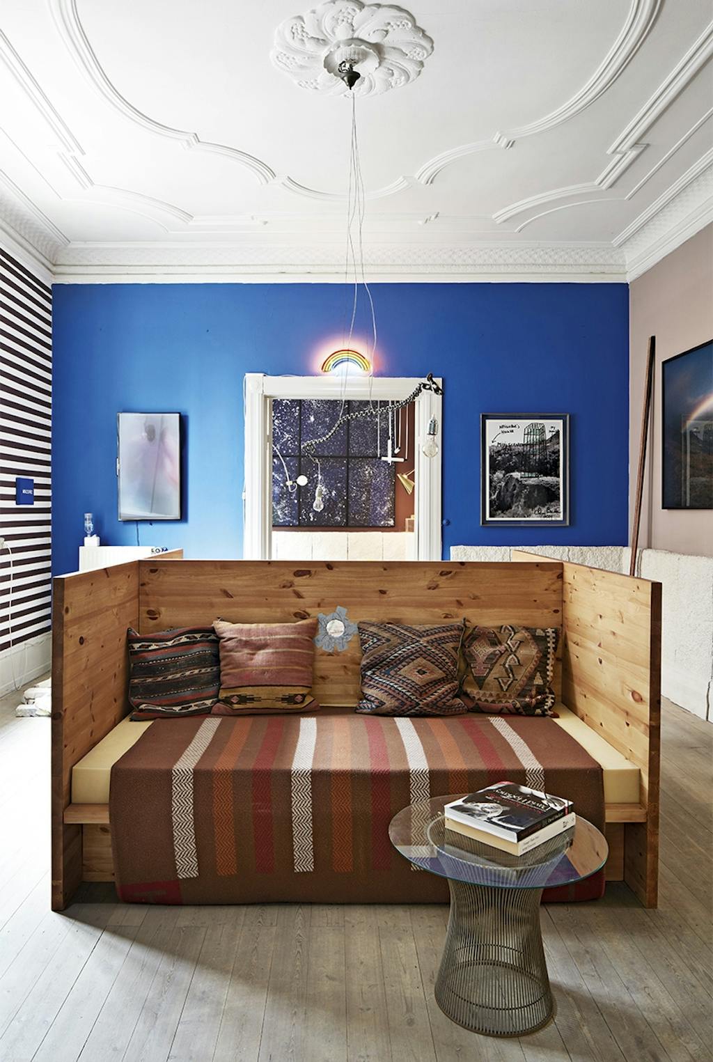 Over sofaen af Mikkel Carl hænger en svævende lænke. Det er en lampe af den østrigske kunstner Franz West. Bordet er lavet af Warren Platner for Knoll, mens sofaen er pyntet med puder lavet af gamle kelim-tæpper. Den lysende regnbue over døren er af danske Ulrik Weck og har været udstillet i Peter Ambys galleri.