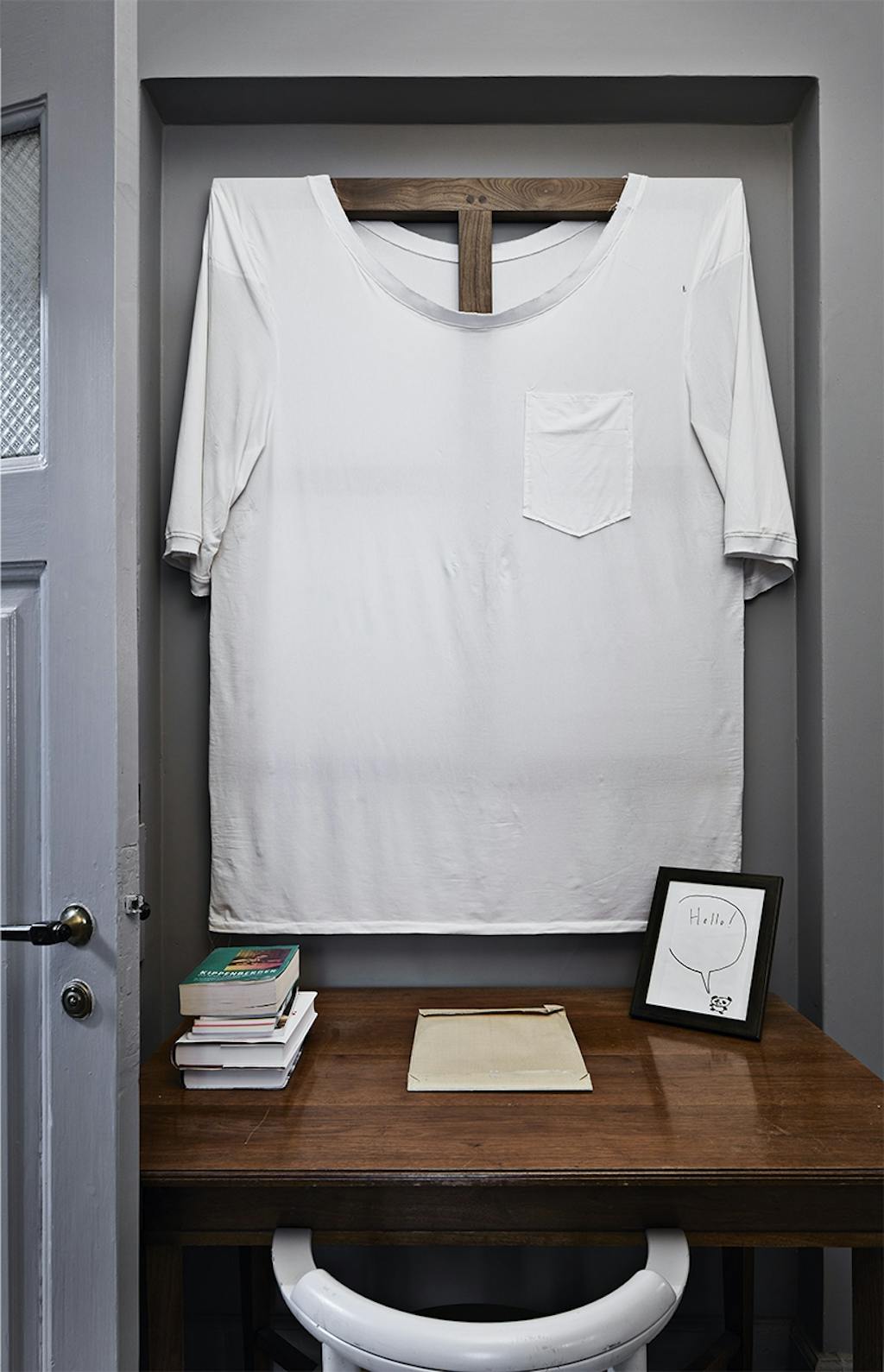 I mellemgangen hænger et selvportræt af kunstneren James Viscardi, som over en periode lavede oversized stofværker, der illustrerede det tøj, han selv gik i.