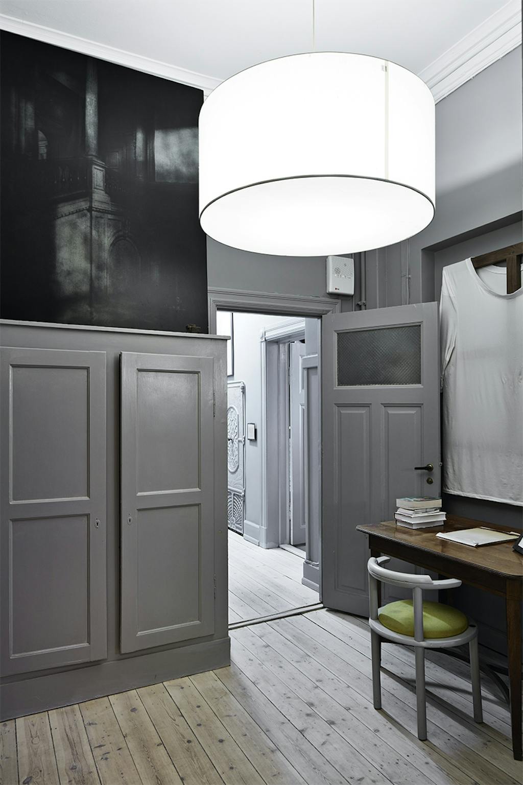 Gangen lyses op af en Round Boon-lampe fra Moooi. Værket over skabet er lavet af Peter Ambys storebror, Balder Olrik. Stolen er fundet på auktion.