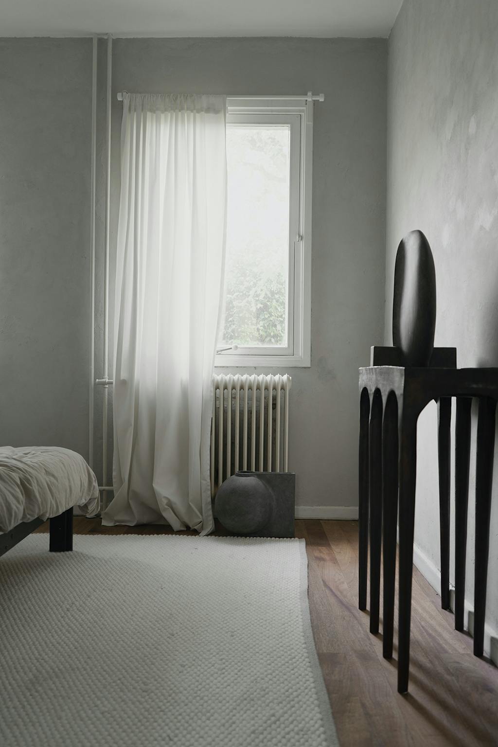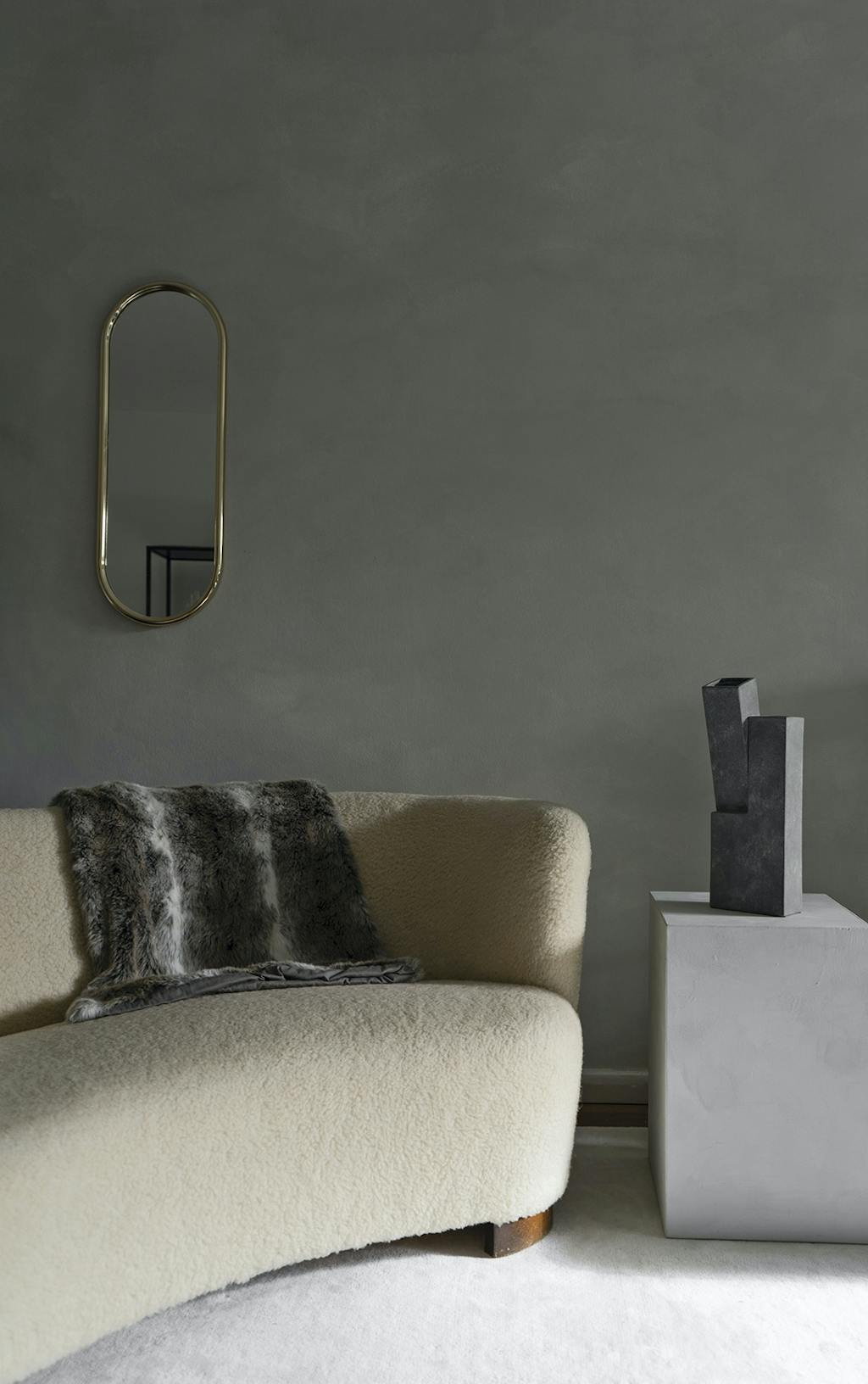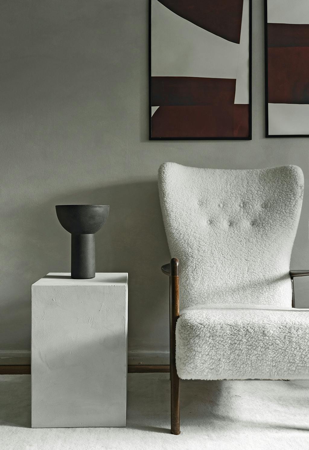 Den cremefarvede sofa er en svensk vintagesofa fra 30’erne. Mikey købte den, fordi han forelskede sig i dens buede former. Piedestalen har Mikey selv lavet, ligesom han også selv har stået for den rustikke vægbehandling, som passer godt til den brutalistiske stil, som er gennemført i hele hjemmet.