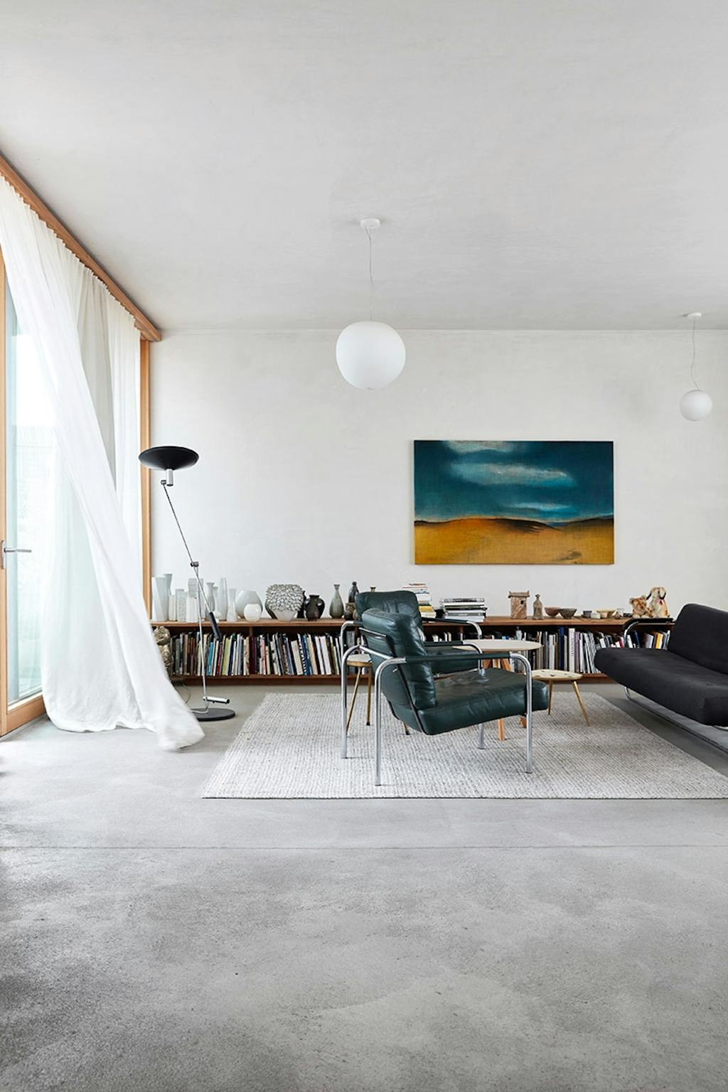 En utrolig smuk og veludført spiralformet betontrappe fører op til husets fire etager med hendes atelier nederst, hans studio over, hvor modeller af huset afslører, at han selv har tegnet det, og så den private lejlighed øverst med terrasser til begge sider, så Berlins tage kan beundres, og lyset vælder ind.