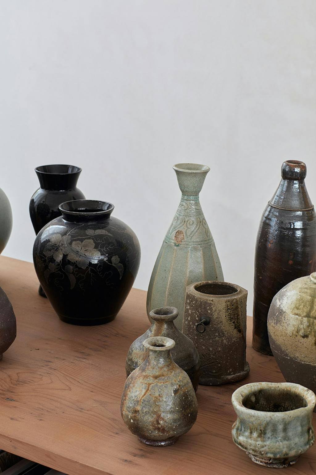 Rundt omkring står japansk keramik – nogle yderst kostbare objekter skabt af nogle af Japans ypperste mestre, som blander sig med kunstnerens værker, både malerier, skulpturer og fotografier.