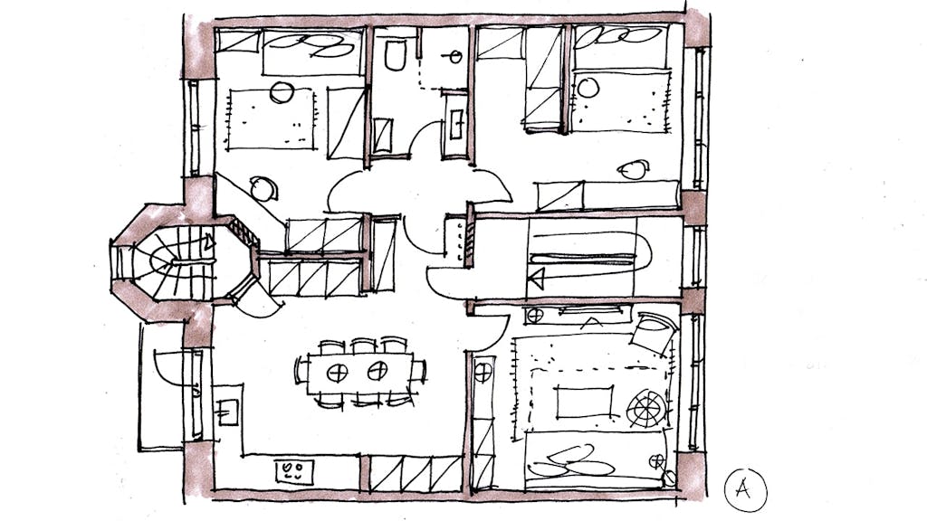 Jeg har lavet 2 skitser til dig, en hvor dine børn får hver deres værelse og hvor I voksne får en sofa/divan/seng i stuen. Det viser med ret stor tydelighed at I voksne får svært ved at få plads til jeres klædeskabe, som derfor er fordelt ud i børneværelserne. Man har jo en vis bunke ejendele som der skal være plads til. I entreen er der desuden plads til et par højskabe i dybde 35 cm og i alrummet kunne der blive god plads til højskabe som angivet som firkanter med diagonal streger. Med hensyn til jeres store runde bord, så sætter det begrænsninger fordi der hurtigt bliver for smalt at passere omkring det, så I kunne overveje at skifte det ud med et smallere langbord og derved få meget bedre manøvreplads i alrummet? Imellem badeværelse og alrum kan I evt sætte en glasdør op, så der er støjdæmpet imellem alrum og børn / badeværelse. Skitse B: Der er I rykket ind i værelset mod gården, med plads til det ønskede arbejdsbord. Børnene deler et værelse ved at der er sat en let skillevæg op i midten, så de får en privat afdeling hver, og så har I alle sammen stuen til fælles med god plads til den lange dobbelt- divan, småborde og fælles hygge. Deleværelset er fint så længe børnene er mindre, så I kan jo evt. starte med den plan og så se om I skal gå til plan A senere.