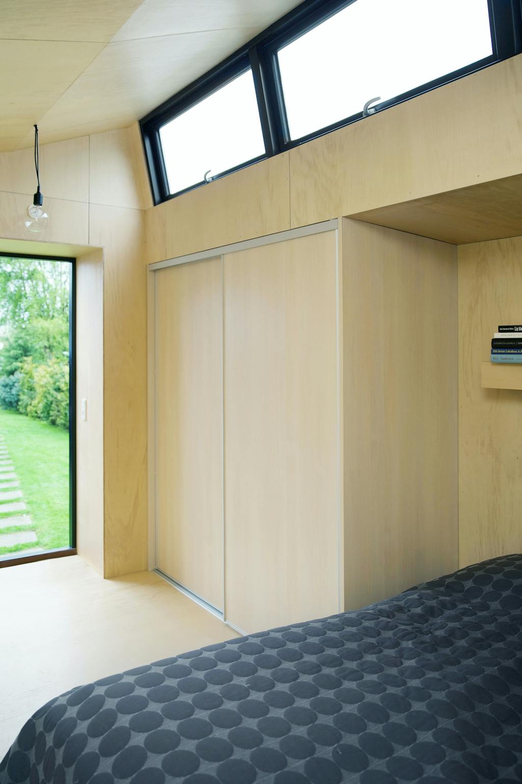 Grundtanken om at bygge kvadratisk og i rene linjer går igen i den indbyggede kasse til sengelys og i radiatoren, der ligeledes er skjult af en kasse i finér - og er dermed også i tråd med enkel, japansk æstetik. En seng og en stol er eneste flytbare møbler. Klædeskab, boghylde og siddeplads i karnappen er integreret og tilpasset husets form. Finérbeklædningen er anbragt med en smule mellemrum - svarende til tykkelsen på en malerørepind.