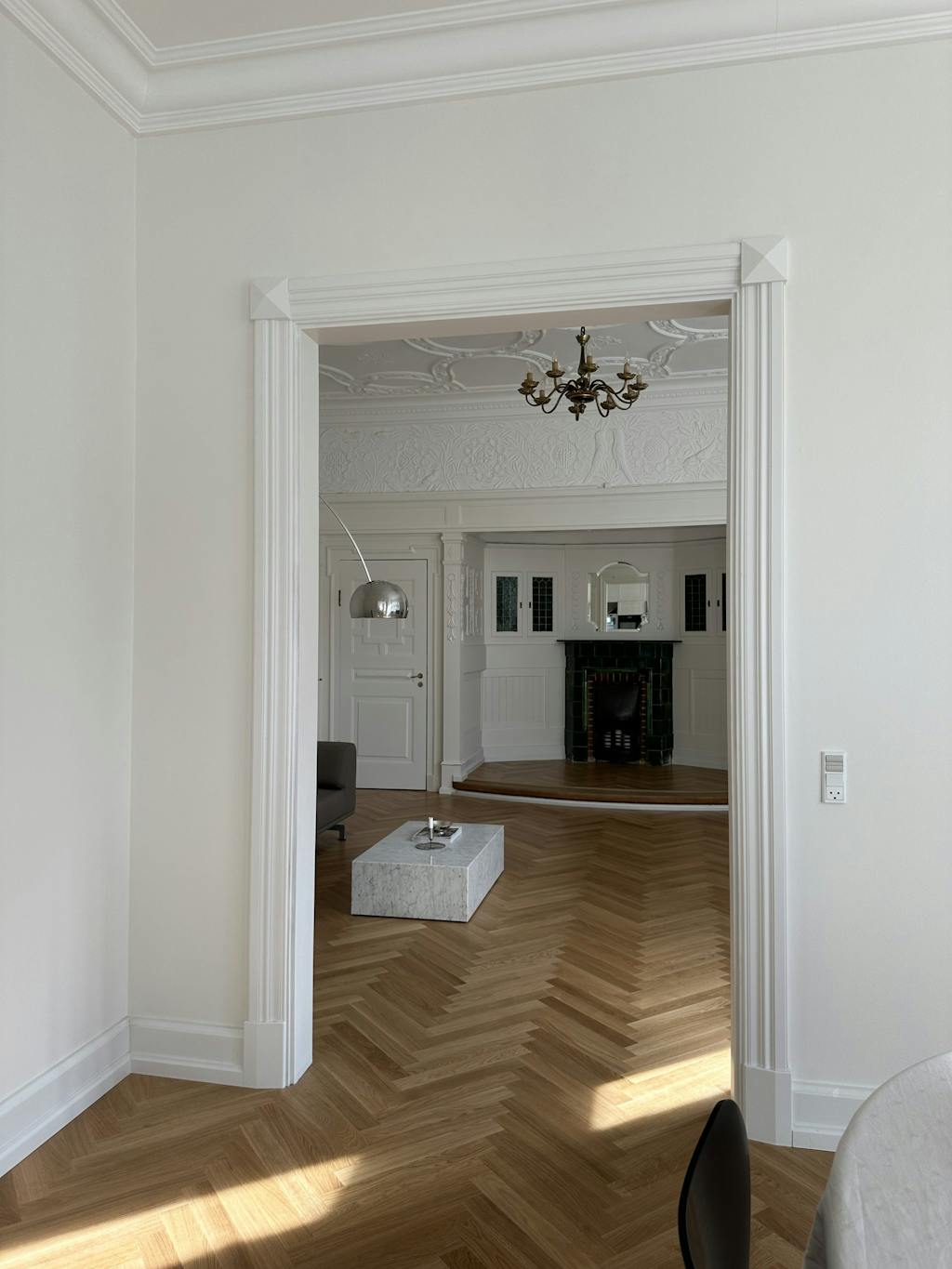 I stuen mod vandet er der indrettet med et Kold Christensen-produceret Kjærholm PK54-spisebord med cipollinimarmor, samt fire stole designet af Fabricius & Kastholm. Op ad endevæggen er placeret en Kjærholm-sofa, PK31, i patineret cognagfarvet læder. En forniklet Vilhelm Lauritzen-standerlampe hygger i hjørnet, og over spisebordet hænger en gammel PH-lampe med topskærm af metal og underskærme af opalglas – med navnet PH6. På væggen hænger et maleri af Mogens Andersen og et kobberrelief.