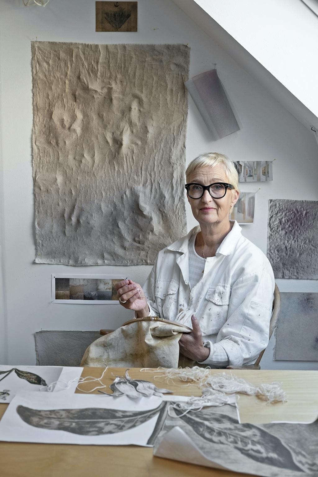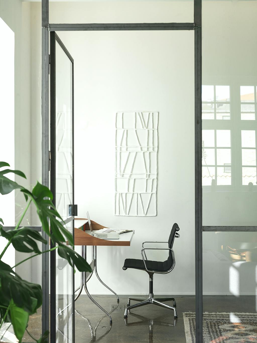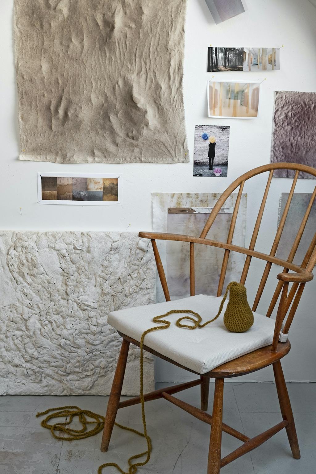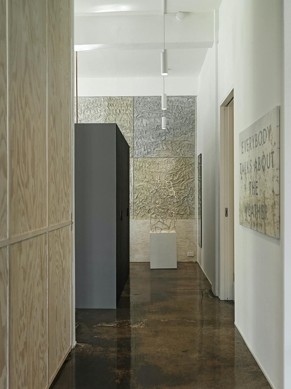 AfTekstilkunstneren Hanne Gaard Grønlund, som bruger kunstnernavnet Hanne G, bor i en gammel nedlagt blyantsfabrik i København sammen med sin mand, Nicolay, og hunden Blomst. Både i sit hjem og i sin kunst bygger hun bro mellem tradition og modernitet, og i den proces ser man altid hendes refleksioner over bæredygtighed. Lejligheden fungerer som et multifunktionelt sted, der rummer familiens bolig, kontor og showroom. Farveskalaen i Hannes værk Relief blander sig med trævæggens synlige årer, samtidig med at det tilføjer struktur til den ellers hvide og glatte overflade.