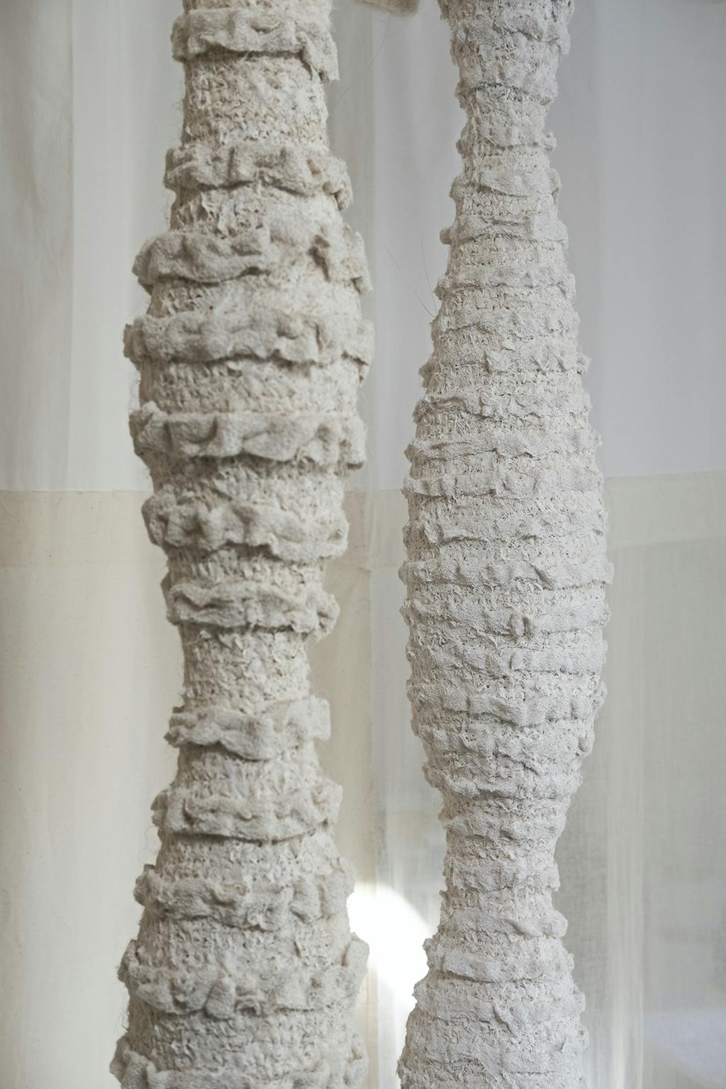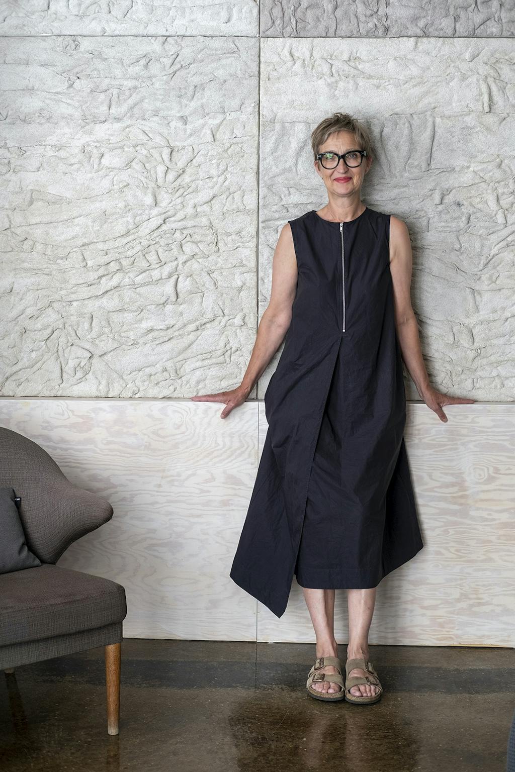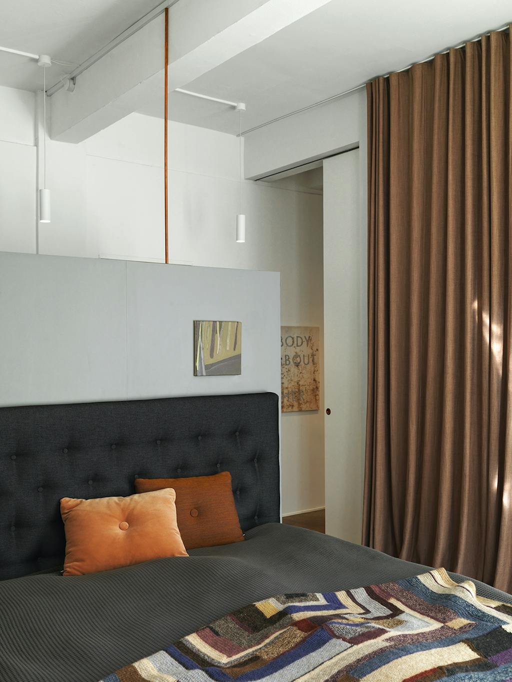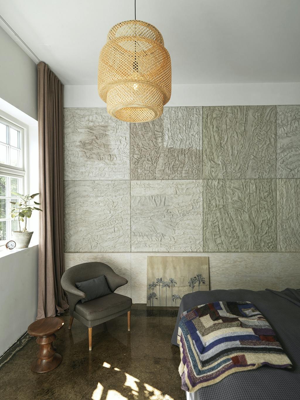 AfTekstilkunstneren Hanne Gaard Grønlund, som bruger kunstnernavnet Hanne G, bor i en gammel nedlagt blyantsfabrik i København sammen med sin mand, Nicolay, og hunden Blomst. Både i sit hjem og i sin kunst bygger hun bro mellem tradition og modernitet, og i den proces ser man altid hendes refleksioner over bæredygtighed. Lejligheden fungerer som et multifunktionelt sted, der rummer familiens bolig, kontor og showroom. Farveskalaen i Hannes værk Relief blander sig med trævæggens synlige årer, samtidig med at det tilføjer struktur til den ellers hvide og glatte overflade.