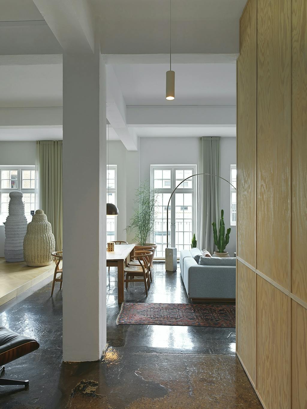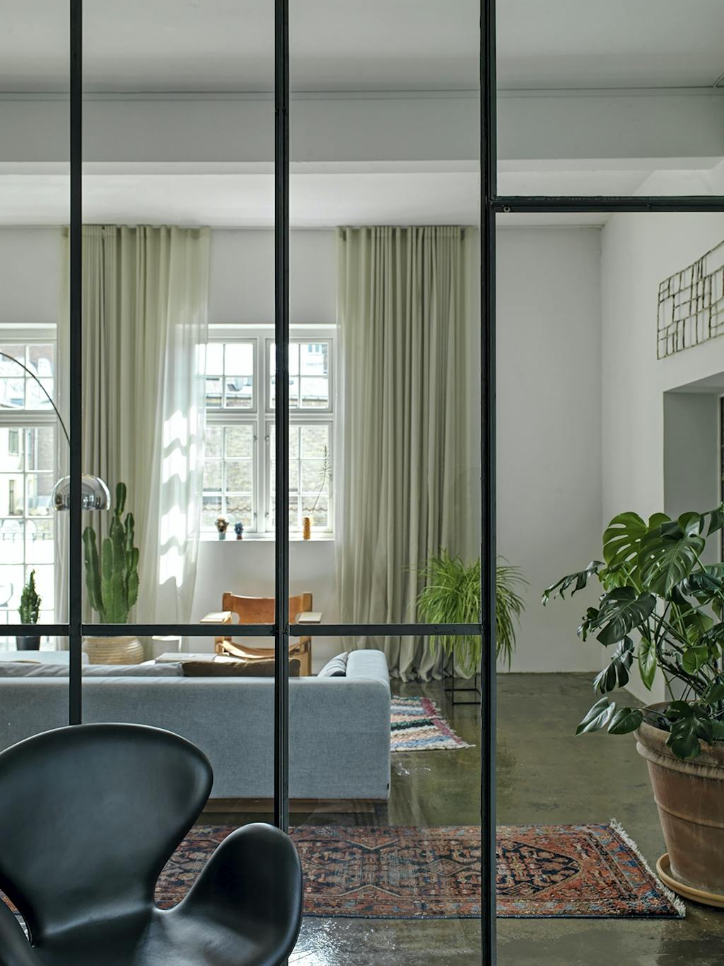 Den gamle blyantsfabrik ligger centralt på Islands Brygge i København, og den rummer både bolig og erhverv. Hanne og Nicolay har bibeholdt elementer fra den tidligere industri, som giver en rå, industriel kant til deres interiør. Under renoveringen blev lejligheden suppleret med udgang til to balkoner, som både skaber et fantastisk lysindfald i stuerne og bibringer lejligheden en ekstra optisk dimension.