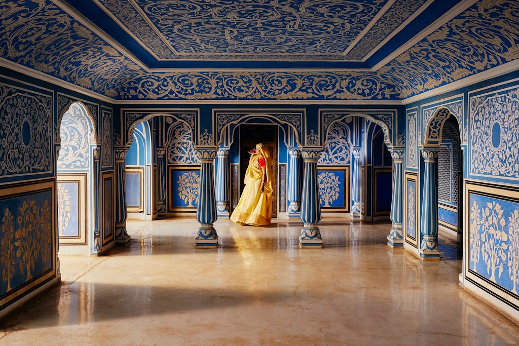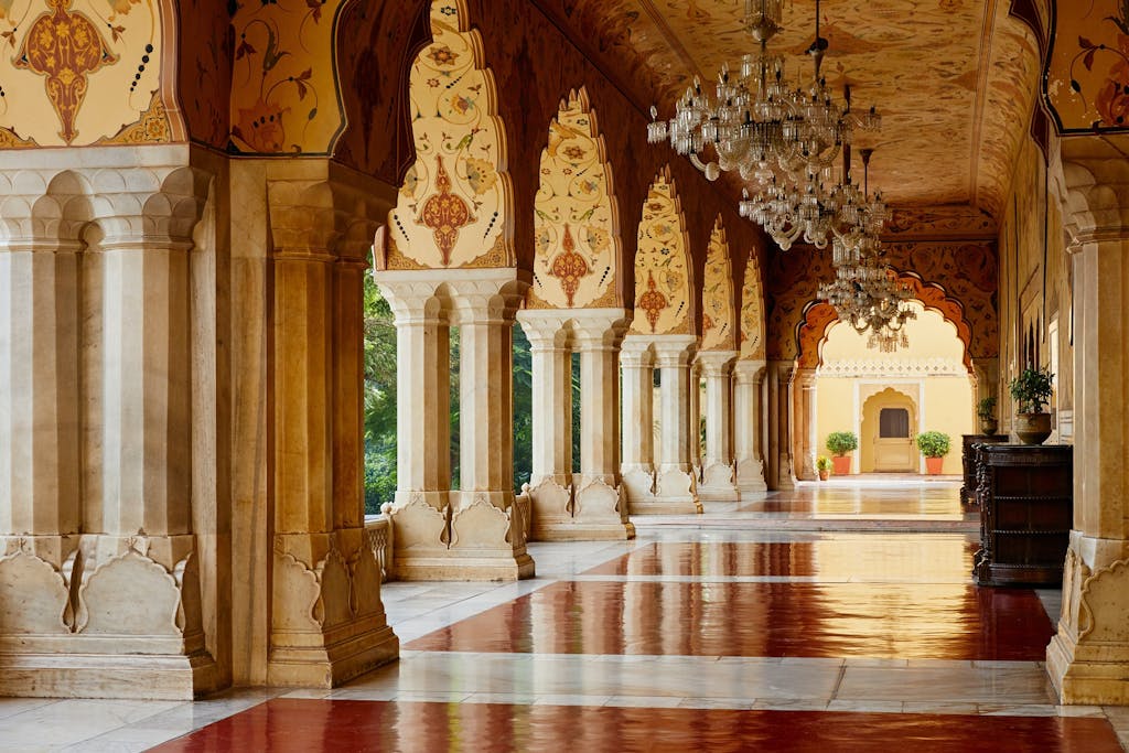 Bygningen er kendt for dets helt særlige og ekstravagante udsmykning. Forestil dig dekadente lysekroner, sandstensvægge malet i guldstøv, håndvævede tæpper, et museum og frodig have, hvor du kan indtage morgenmaden helt idyllisk.