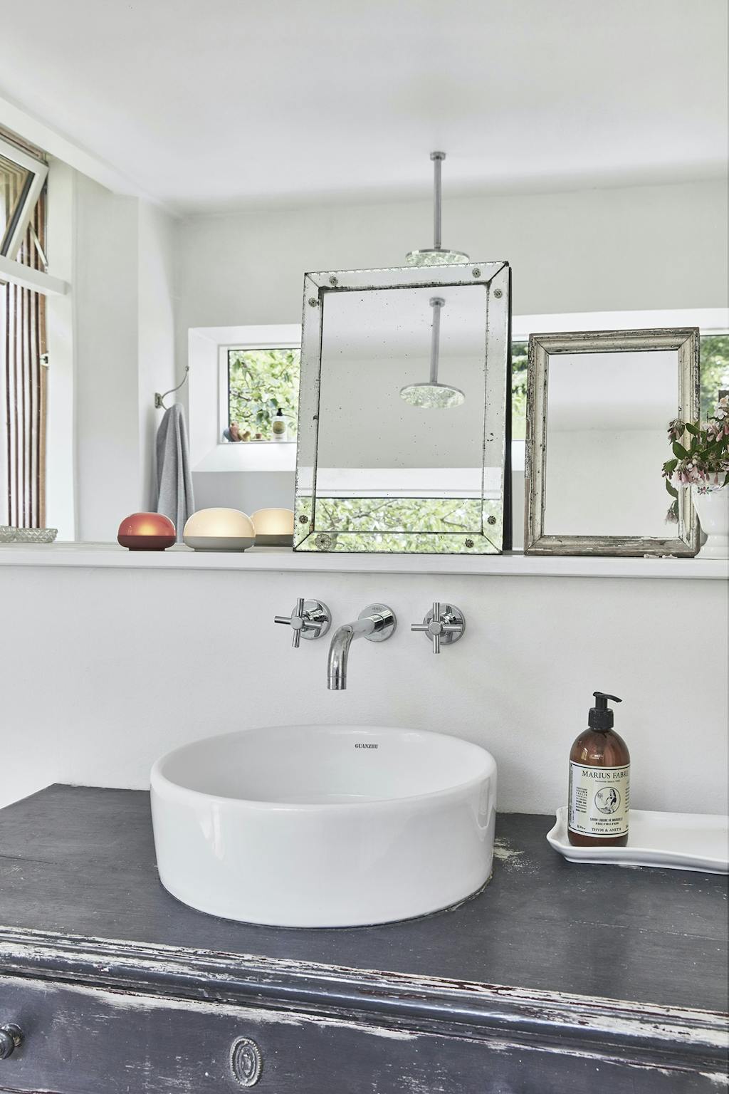 kan nyde fra det solide træbord omgivet af gamle wienerstole. Det har været vigtigt for Maria at indrette sommerhuset med gamle møbler for at putte noget historie ind i det helt nye hus.
