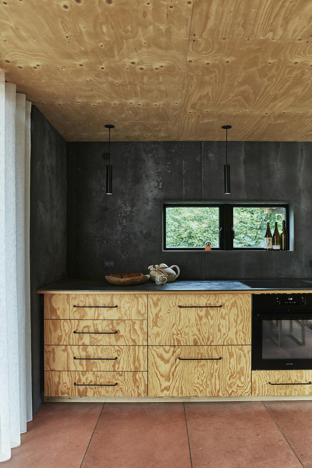 Et af de materialer, som de har testet i deres hus, og som de senere har gjort brug af i deres arbejde, er Viroc. Det er et miljøvenligt kompositmateriale lavet af træsmuld og stenpulver, som hverken kan rådne eller brænde takket være stenpulverets kvaliteter. De har brugt Viroc på gulvet i køkkenet, på terrassen og på væggene og i farverne grå, rød og gul, hvilket giver huset et visuelt særpræg. Et særpræg, som egentlig begyndte et helt andet sted, nemlig med den lyserøde murstensmur med farvet glas, som forbinder de to plateauer med hovedhus og anneks.