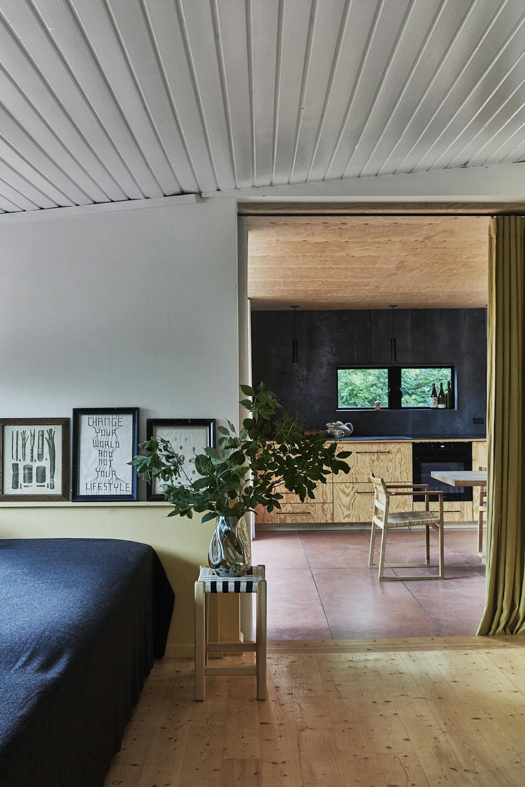 – Det fede ved det her sted er jo, at her er så grønt og vildt. Bag ved huset ligger der en lille å, hvilket er et fantastisk naturelement at have på grunden. Nogle gange flyder der lige en svane forbi, nogle gange nogle ænder. Da vi købte huset, var der lukket af ned til åen, så man skulle om bag det hele for at opdage, at der var en å. Det har virkelig betydet meget for stedet, at vi har fået åbnet på tværs og nu kan høre og fornemme vandet, fortæller Nikoline og tilføjer, at det helt store greb altså har været at lave den her flydende overgang mellem ude og inde og få det til at gå i symbiose med hinanden.