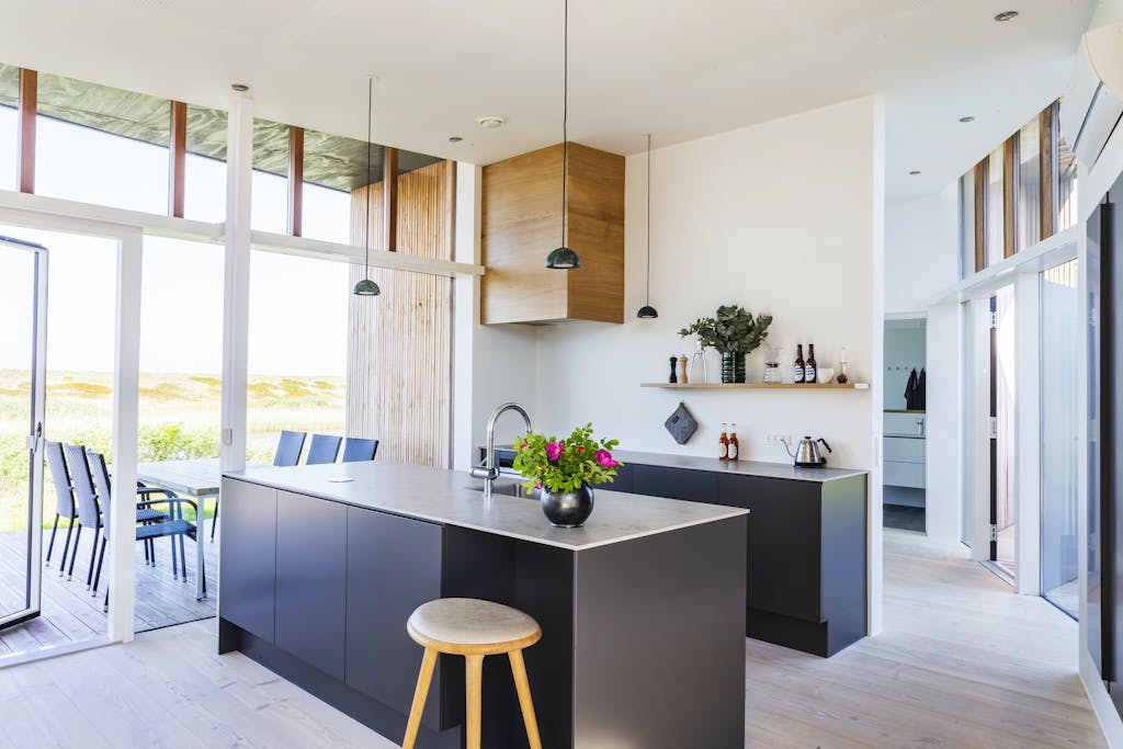 Køkkenet er i flotte mørke nuancer, som kontrast til husets mange hvide flader og er uden overskabe, for at gøre det mere let og luftigt. Søren Sarup har gemt emhætten bag planker af lakeret egetræ. Træet får emhætten til at virke som et møbel og passer desuden godt sammen med husets mange egetræsmøbler. Køkkenet er fra Invita og bygget i malet MDF i farven lavagrå, mens den smukke keramiske bordplade er fra DFI Geisler. De mørkegrønne lamper er fra Hay, mens barstolen i sæbebehandlet eg er fra Mater. På hylden står et par Cold Hawaii-øl fra det lokale bryghus.