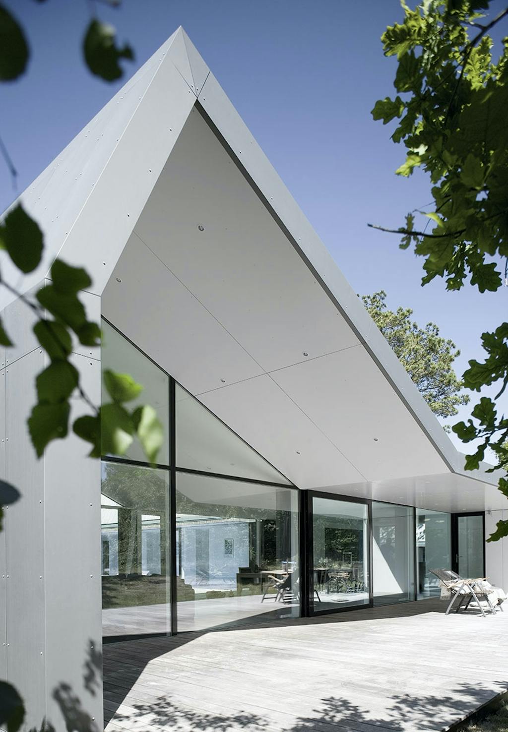 Huset på 220 m2 er tegnet af Christian Cold fra arkitektfirmaet Entasis, så det på en gang springer i øjnene og smelter ind i den omgivende natur. Midlerne til at opnå denne ganske modsatrettede effekt er en målbevidst brug af materialer, strukturer og formgivning: sommerhuset består af tre bygninger – et hovedhus i beton, glas og aluminium, der har en tilknyttet sidebygning, der er beklædt med ubehandlet cedertræ ligesom annekset, der rummer garage, bådehus samt en gæsteafdeling med plads til seks personer.