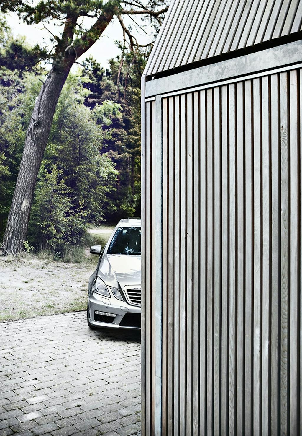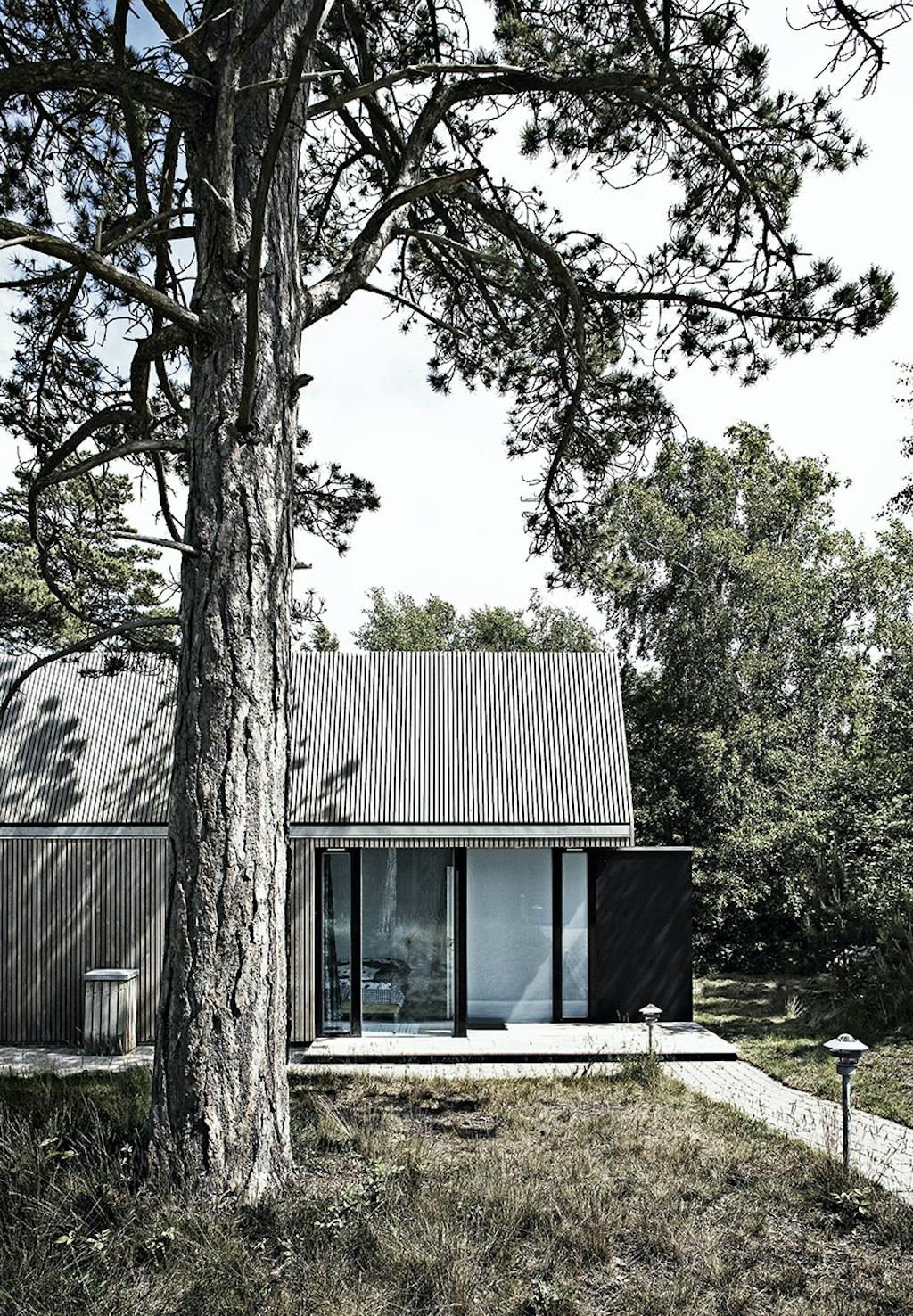 Ejerne forklarer, at de ønskede et hus, der udstrålede en hård kølighed, hvor beton i kombination med store glasflader med aluminiumsrammer bringer naturen indenfor – men samtidig skaber en afstand til den. Men parallelt med dette ville de også have en bygning, der byder velkommen med den varme, man traditi- onelt forbinder med sommerhuse, der som regel er bygget i træ. Valget faldt på cedertræ, der i sin ubehandlede form patinerer til en smuk grålig tone, der går perfekt i spænd med den sandede grund og fyrretræernes bark.