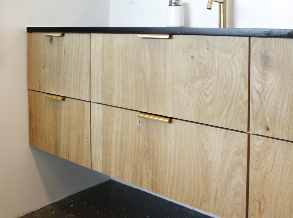 Træmaterialerne, der flittigt er blevet brugt, er egetræ. Lige fra spisebordet og trægulvene, til fronterne i køkkenet.