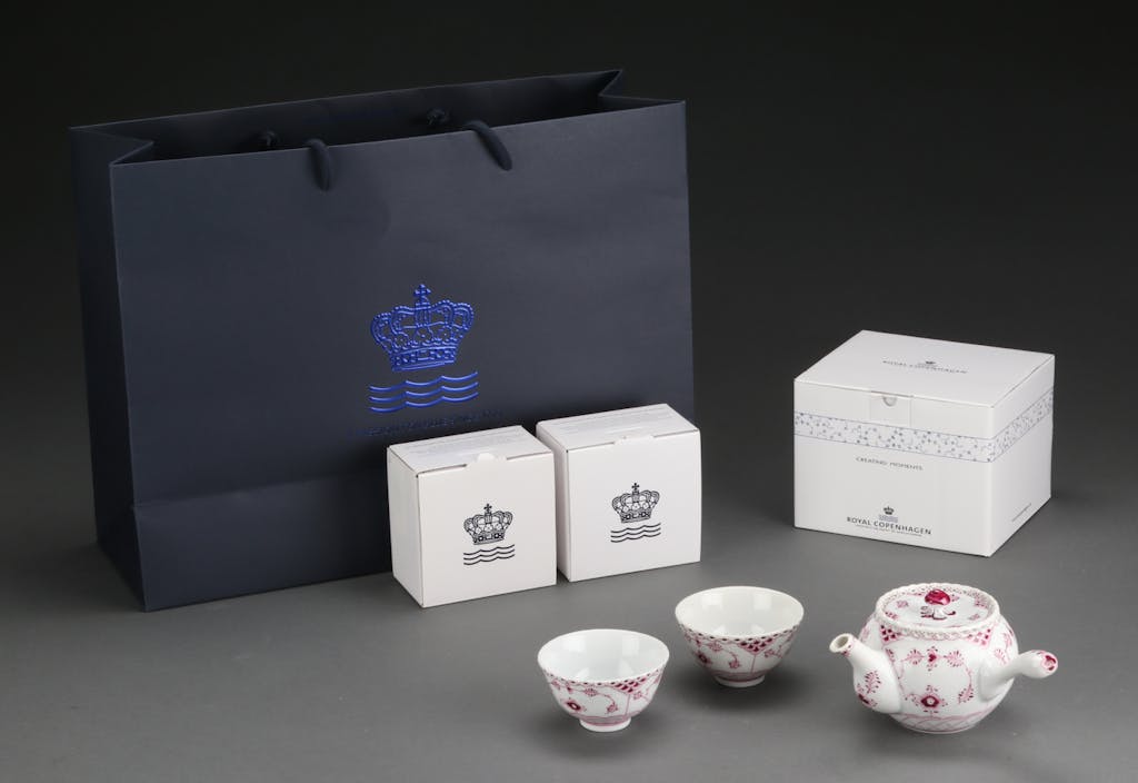 Det elegante tesæt er unikt og kun fremstillet i få eksemplarer hos Royal Copenhagens produktion i Danmark i 2004 med henblik på salg i Japan. Sættet er håndmalet i den sjældne og historiske purpurfarve, som har en varm og intens glød. Farven håndmales ovenpå porcelænet efter, at det er glaseret og brændt i ovn. Stil og formsprog har klare asiatiske referencer, og den lille kande og små kopper er oprindeligt designet servering af traditionel grøn the.