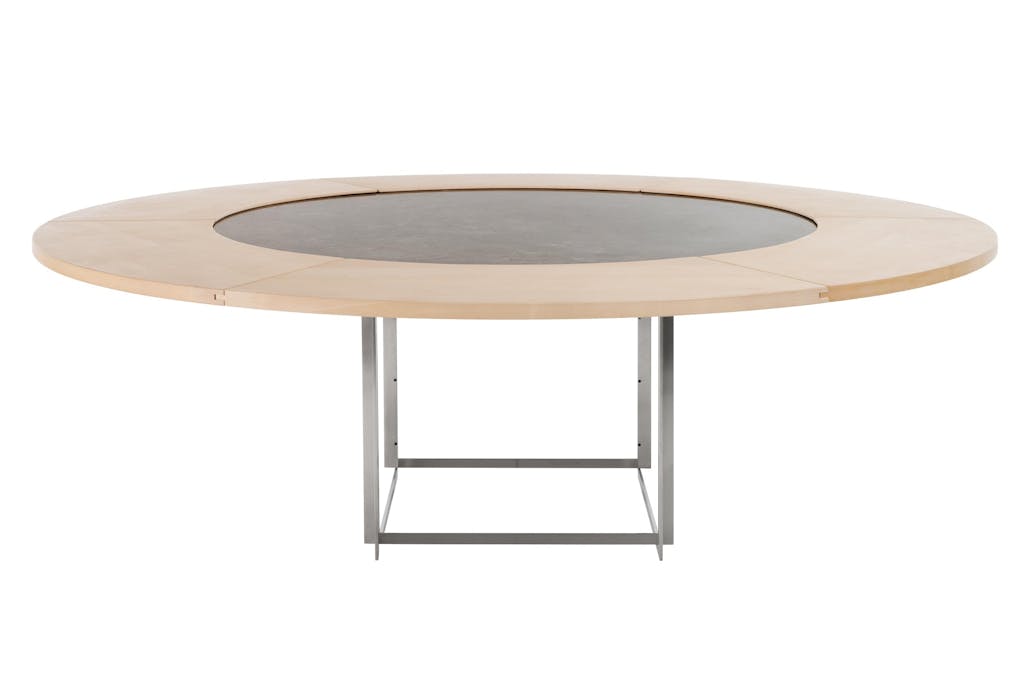 Spisebordet PK54, som Poul Kjærholm tegnede i 1963, er et studie i materialer og form – cirkel møder firkant, og elegant harmoni i stål, træ og marmor opstår. Med ring 126.580 kr., Fritz Hansen.