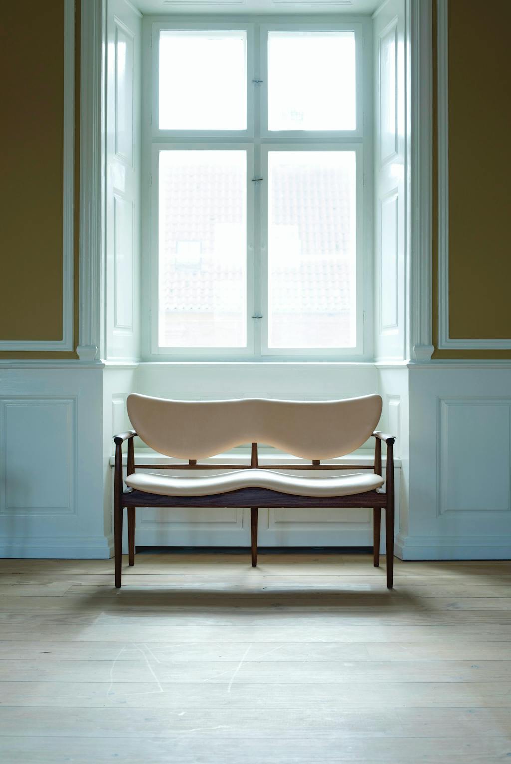 Den er ikke til at stå for! Lille og med bølgende ryg. Sofabænken er en del af 48-serien, der blev præsenteret på Snedkernes Udstilling i 1948. Linjerne er typiske for Finn Juhl, organiske og svungne, og alligevel står sofaen skarpt – og er lige så smuk bagfra som forfra. Ja, det er et af den slags møbler, der bør have 360 graders luft omkring sig, så det kan stå alene og stråle. Karakteristisk for Finn Juhl er også brugen af flere træsorter, hvilket kommer smukt til sin ret her.