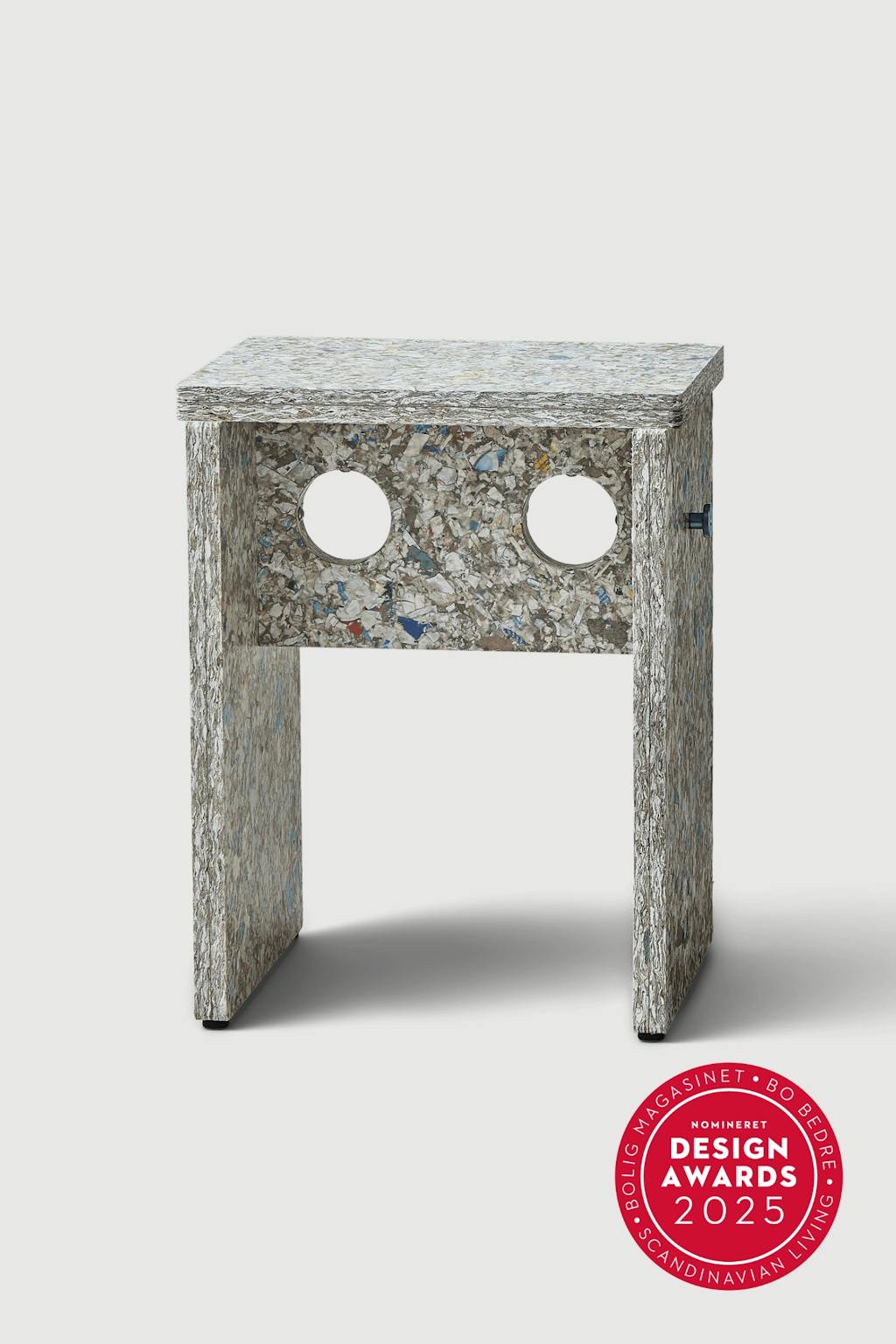 Vi har set masser af design de seneste år, hvor plastaffald er genanvendt i farvestrålende og melerede formationer – også til et punkt, hvor det måske har gjort øjet lidt træt. Jonas Herman har nu forsøgt sig med rester fra drikkekartoner og har ramt en farvekombination og tekstur, som fremstår som en blød og venlig terrazzo, hvilket giver karakter og stemning til skamlen, som i øvrigt kan stables.