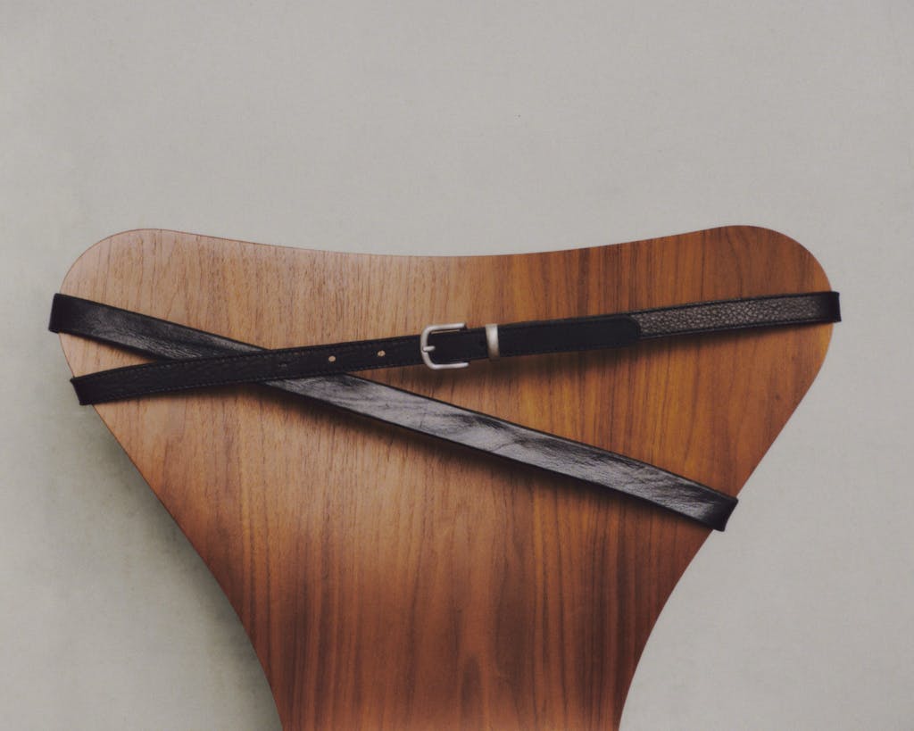 Det vil sige, at Another Aspects har skabt en række accessories - et bælte og en taske - af overskudslæder fra Fritz Hansens møbelværksted. Det gælder læderrester, der har været til polstring.