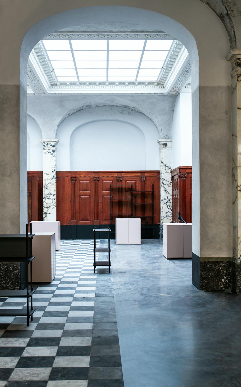 Indretningen af butikken er yderst spændende, da Paustian har formået at kombinere moderne, smukke farver med bygningens originale detaljer, og tilsammen leder det tankerne hen på Milanos smukke paladser.