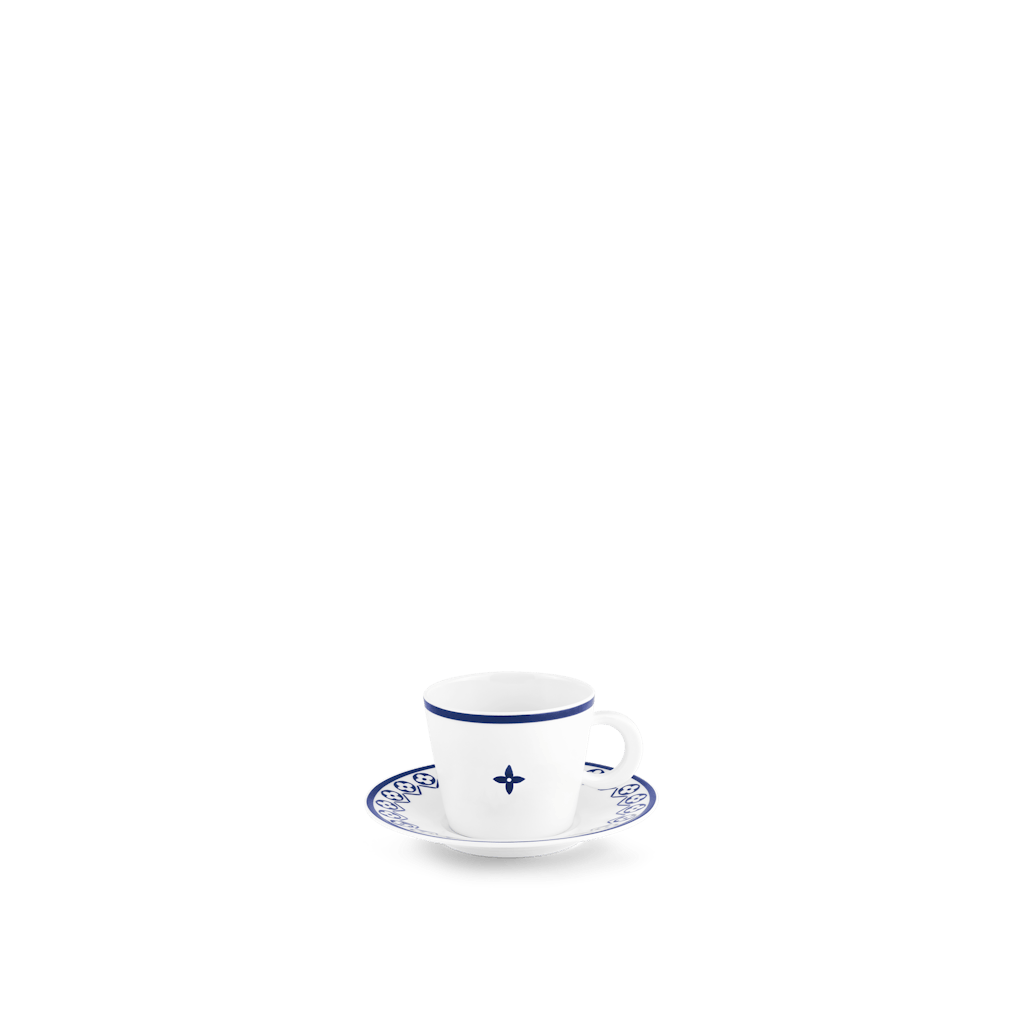 Designet tager udgangspunkt i husets ikoniske blomstermonogram. Men hvor det oftest ses i farver som brun, beige og sort i brug på blødere overflader, er det anderledes på porcelænet.