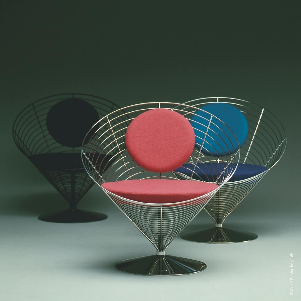 Wire Cone Chair blev skabt af Fritz Hansen i 1988 på baggrund af den såkaldte Plus Linje, Verner Panton skabte i 1959.