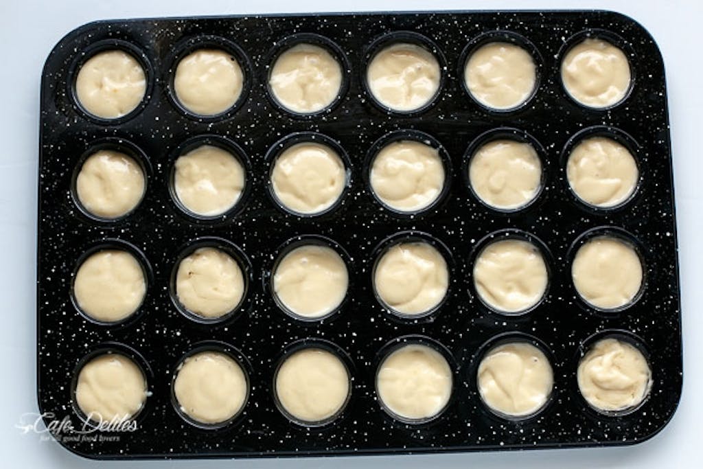 • Fyld dejen ned i formene med en ske. Fyld kun ¾ op i hvert rum.