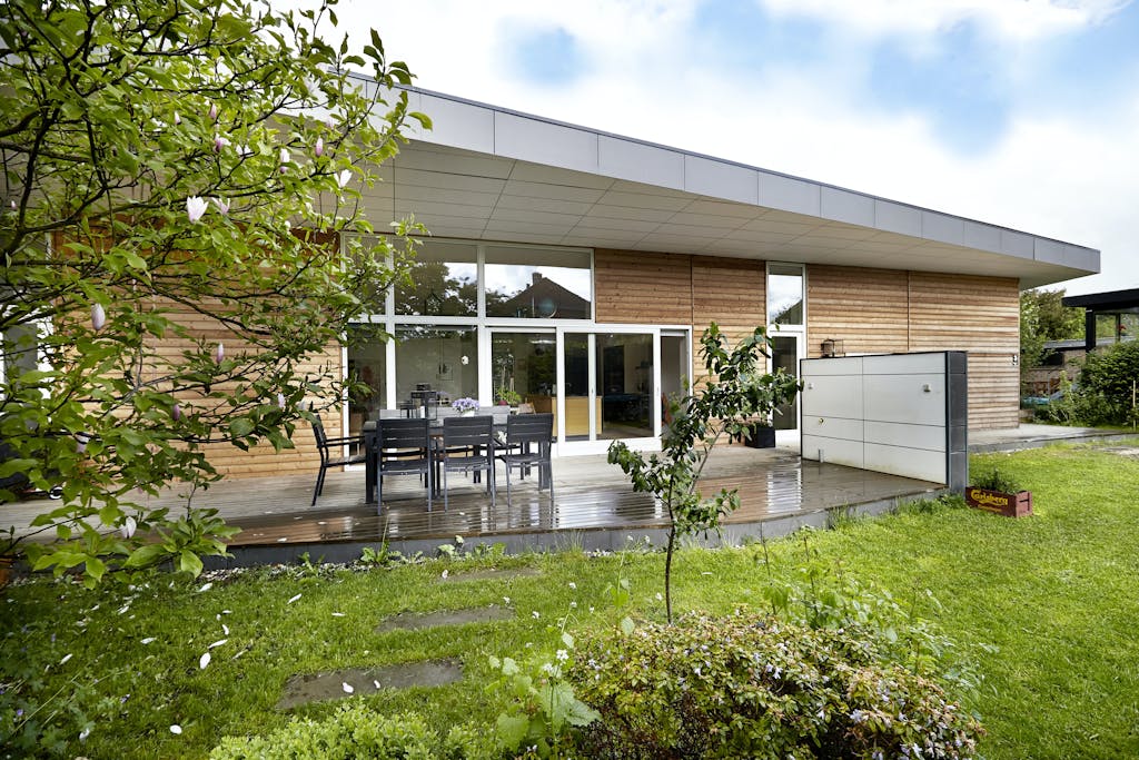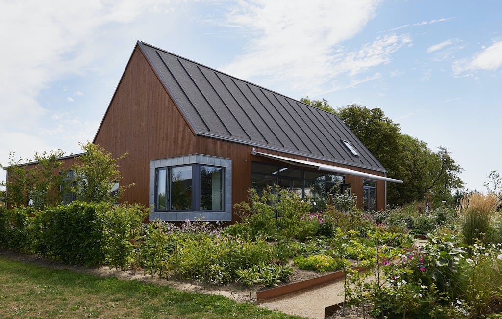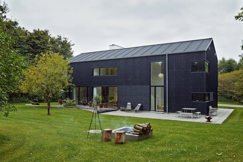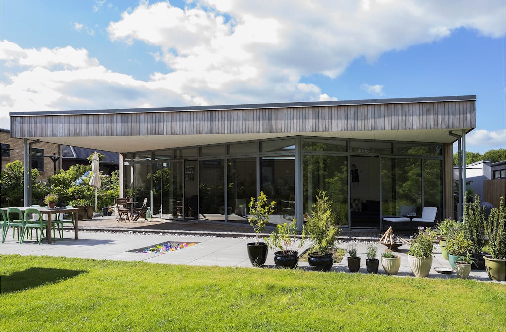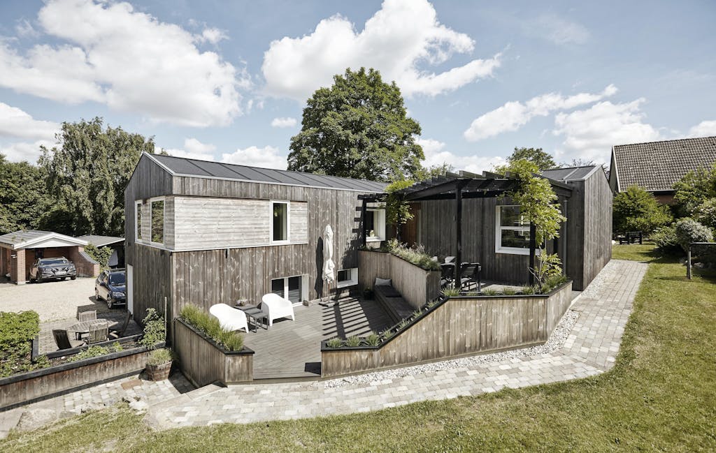 Husets arkitektoniske vinkler skaber spændende krinkelkroge og nicher, ligesom det og levner plads til en overdækket terrasse under udhænget. Krukkerne på terrassen kan hives indendørs når vejret er dårligt, mens den indbyggede sandkasse i terrassen er til stor glæde for familiens børn, når vejret er godt.