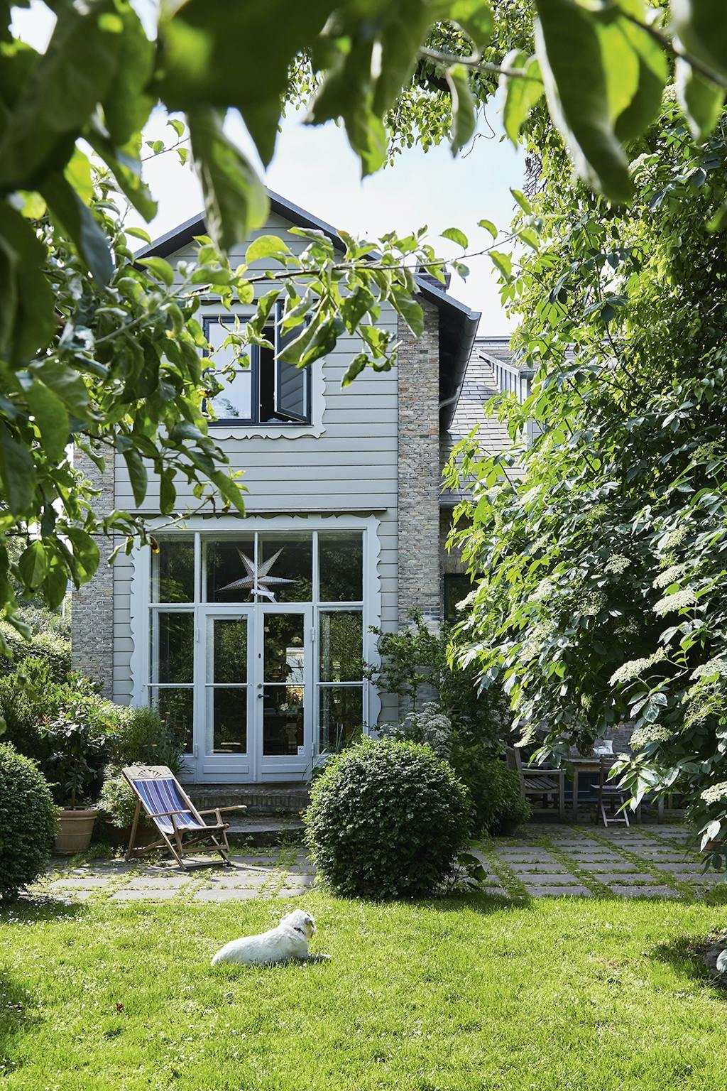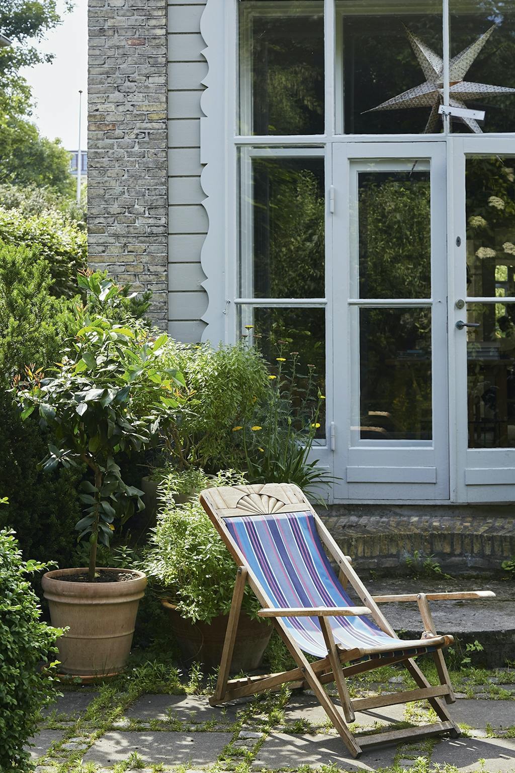 Blandt urter og planter er der masser af rum til et afslappet sommerliv i liggestolen fra 1940'erne, der er fundet hos Bruun Rasmussen.