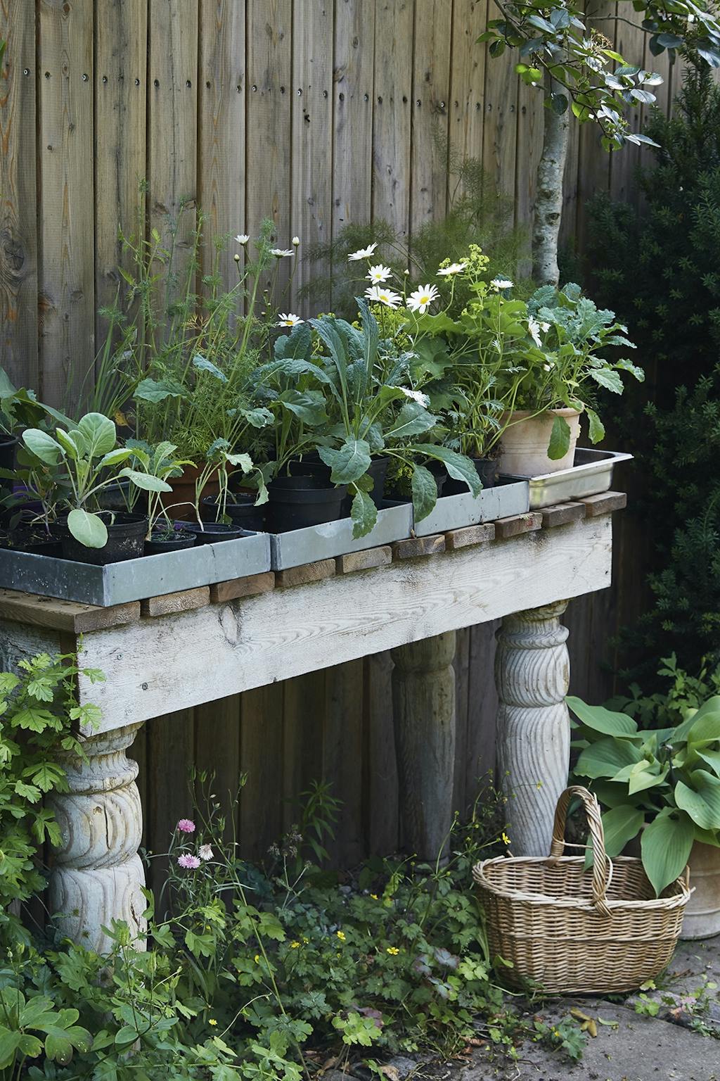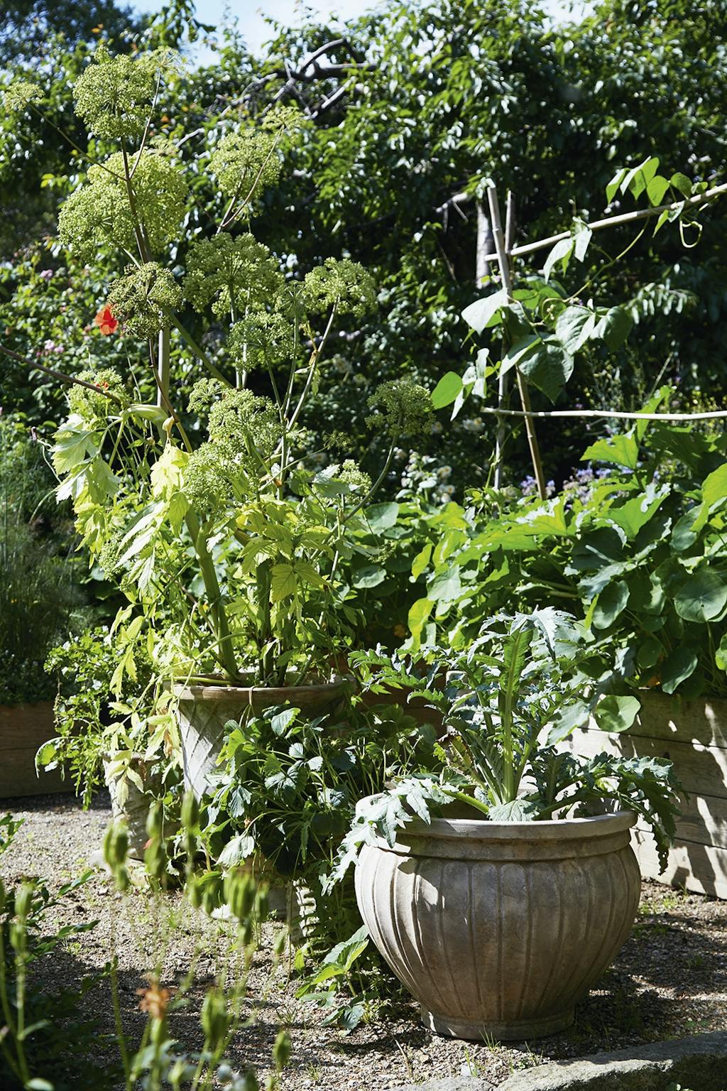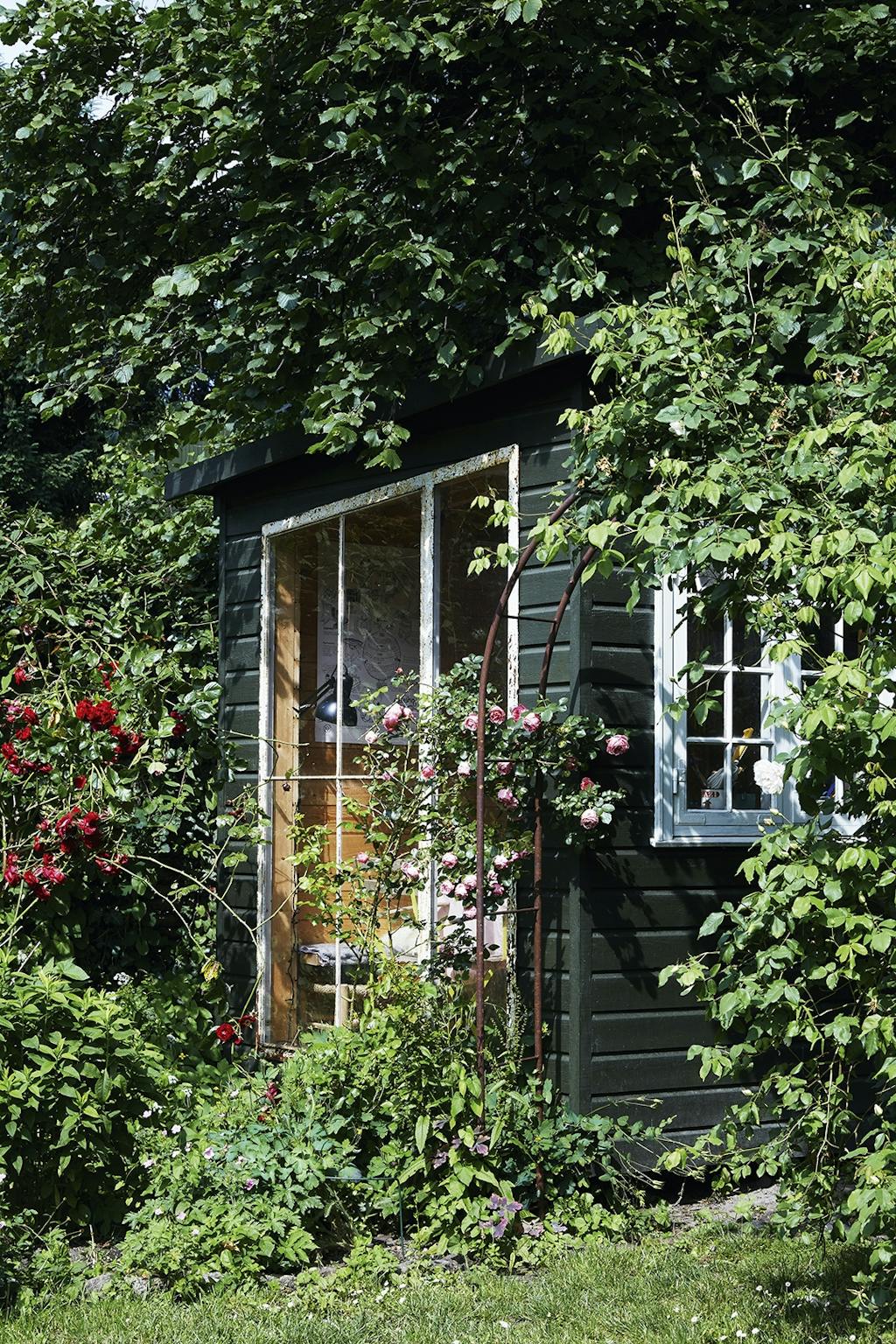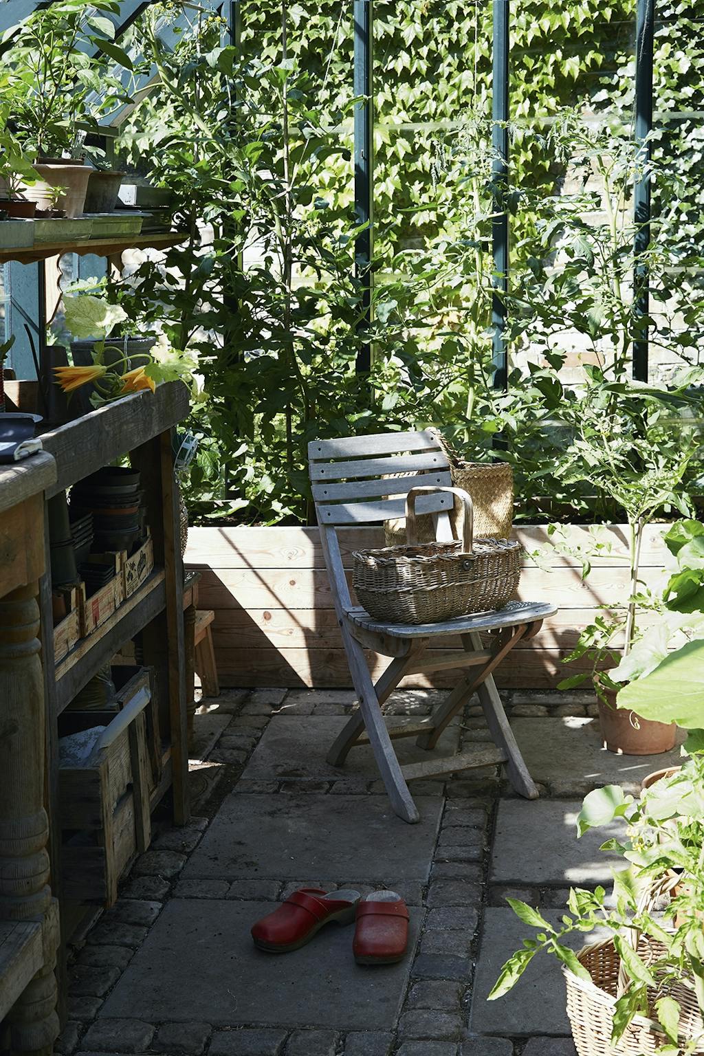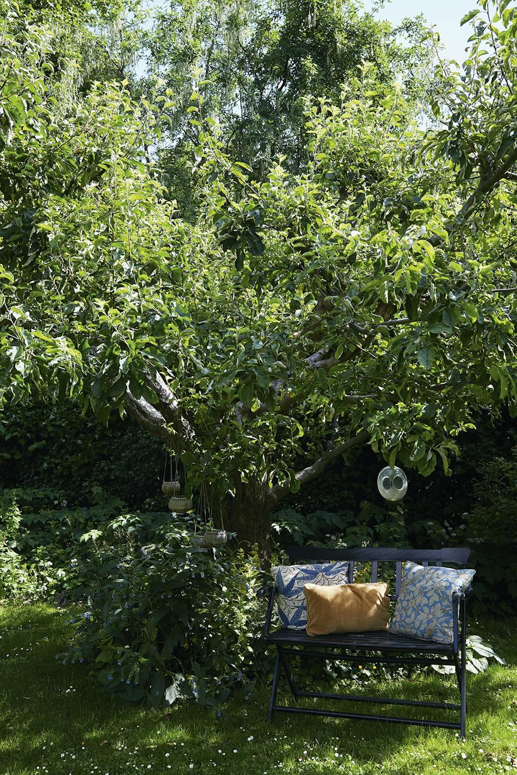 I den ene krog af haven under to Catalpatræer har Adam Aamann indrettet et madværksted med et par gamle borde. Her står et væld af krydderurter som dild og purløg i potter, mens mynten står nedenfor, lige til at plukke. Morteren fra en rejse til Thailand står klar til at mose krydderurter til brug i olier. En høj buksbom skærmer og skaber et mere intimt rum.