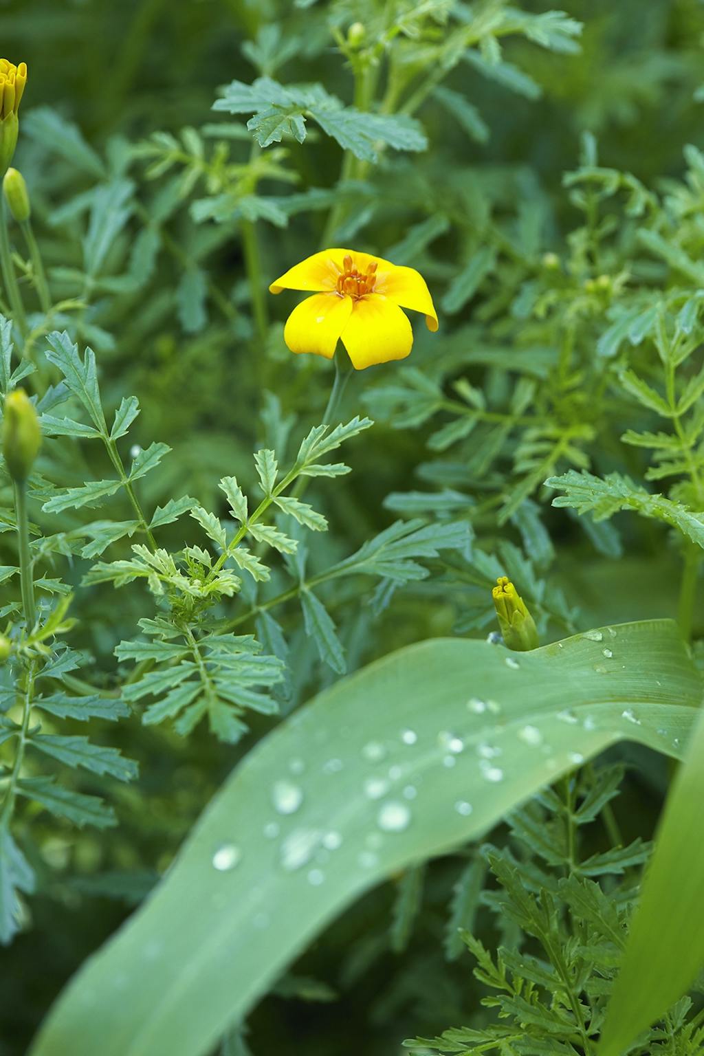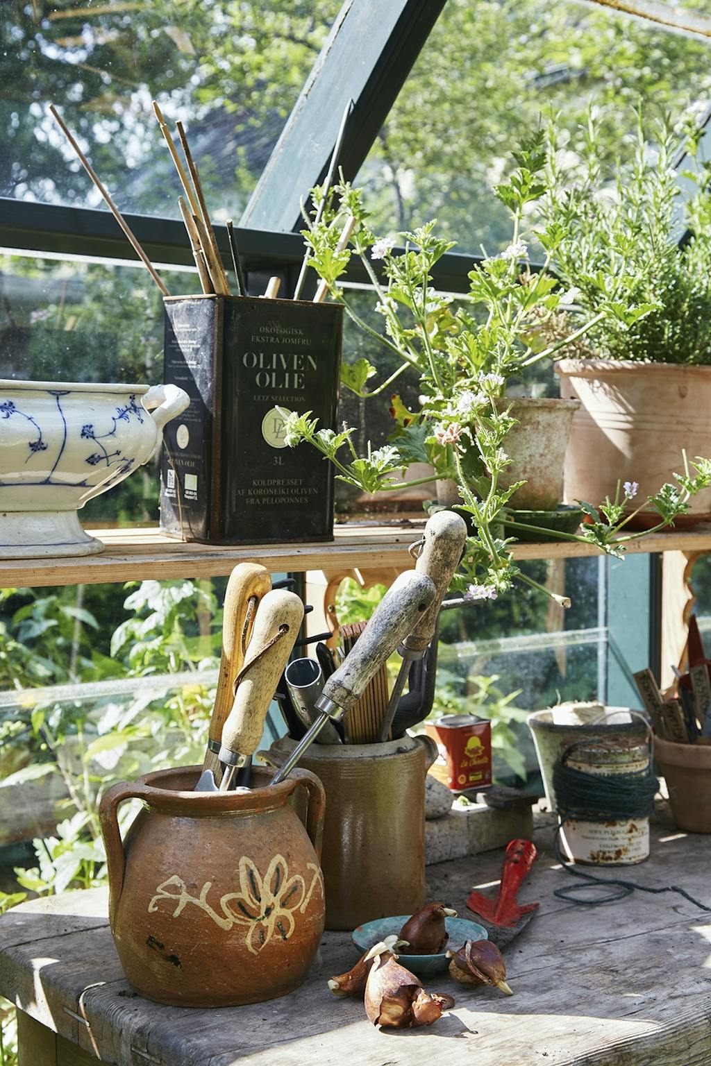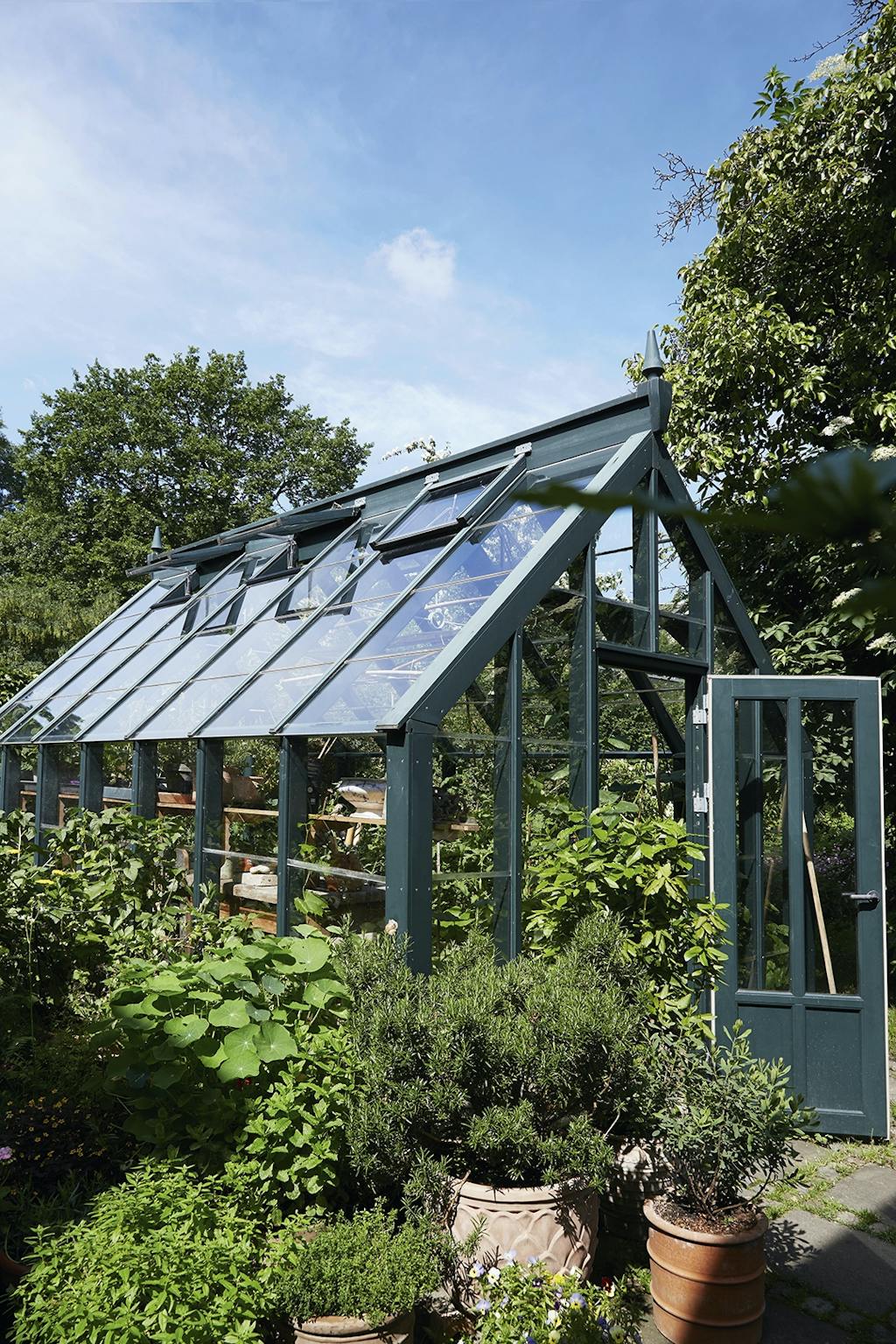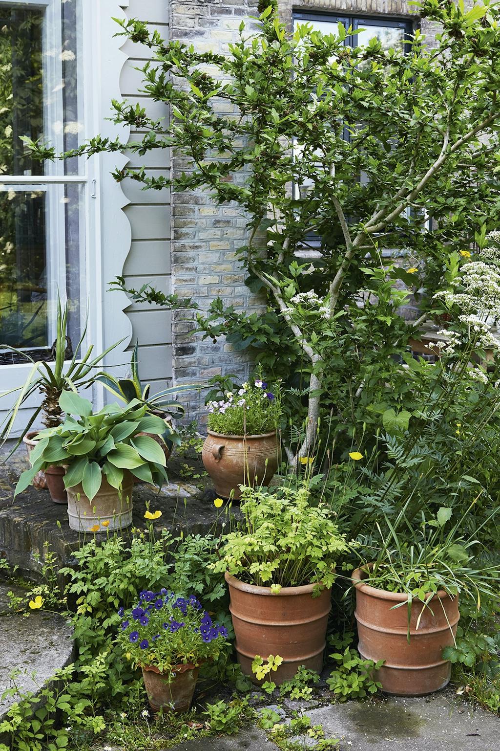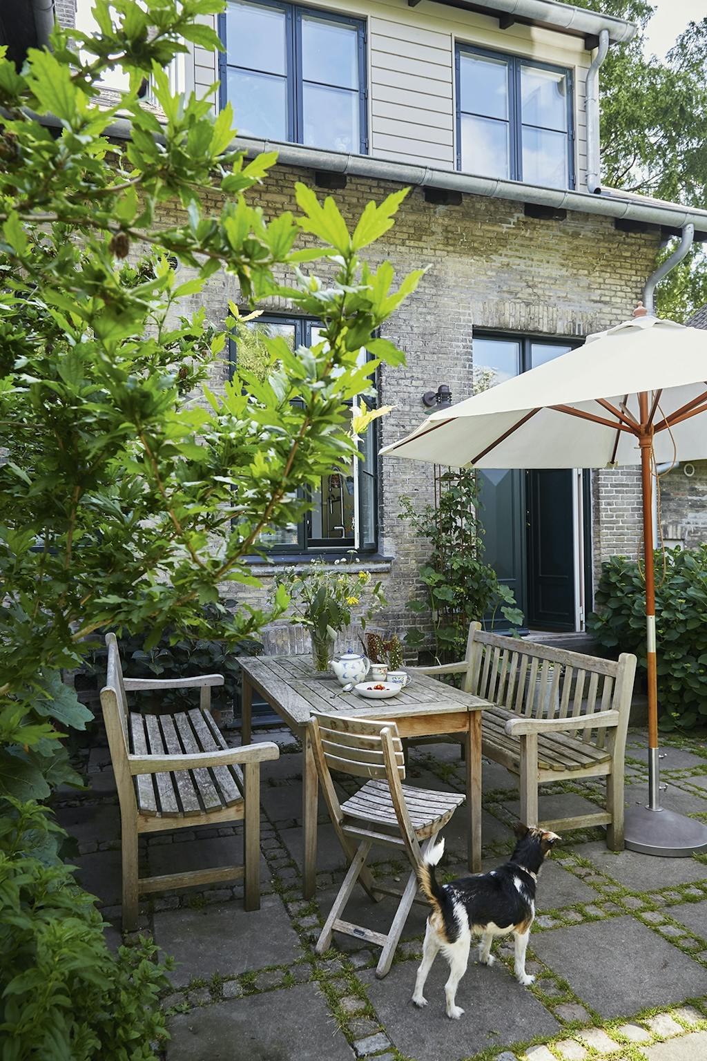 I den ene krog af haven under to Catalpatræer har Adam Aamann indrettet et madværksted med et par gamle borde. Her står et væld af krydderurter som dild og purløg i potter, mens mynten står nedenfor, lige til at plukke. Morteren fra en rejse til Thailand står klar til at mose krydderurter til brug i olier. En høj buksbom skærmer og skaber et mere intimt rum.