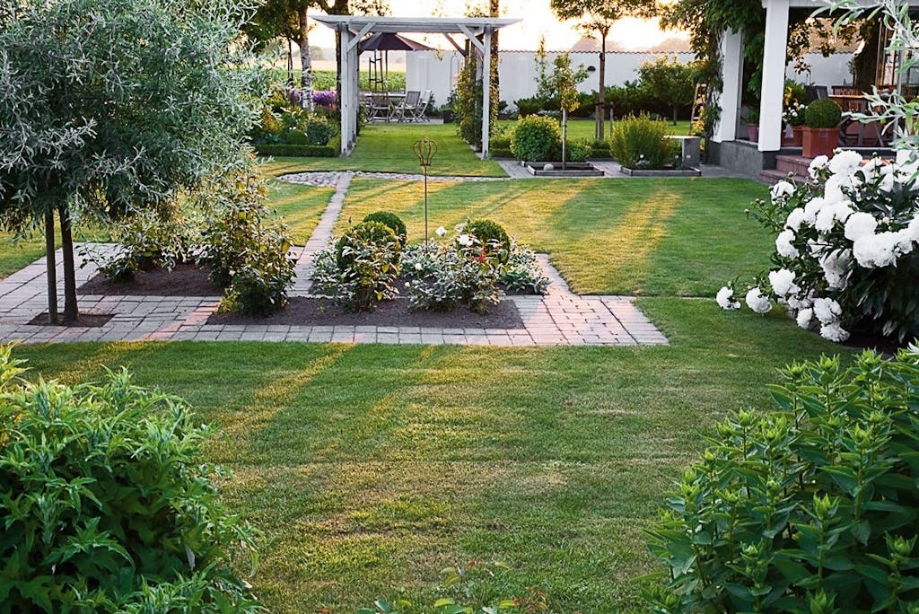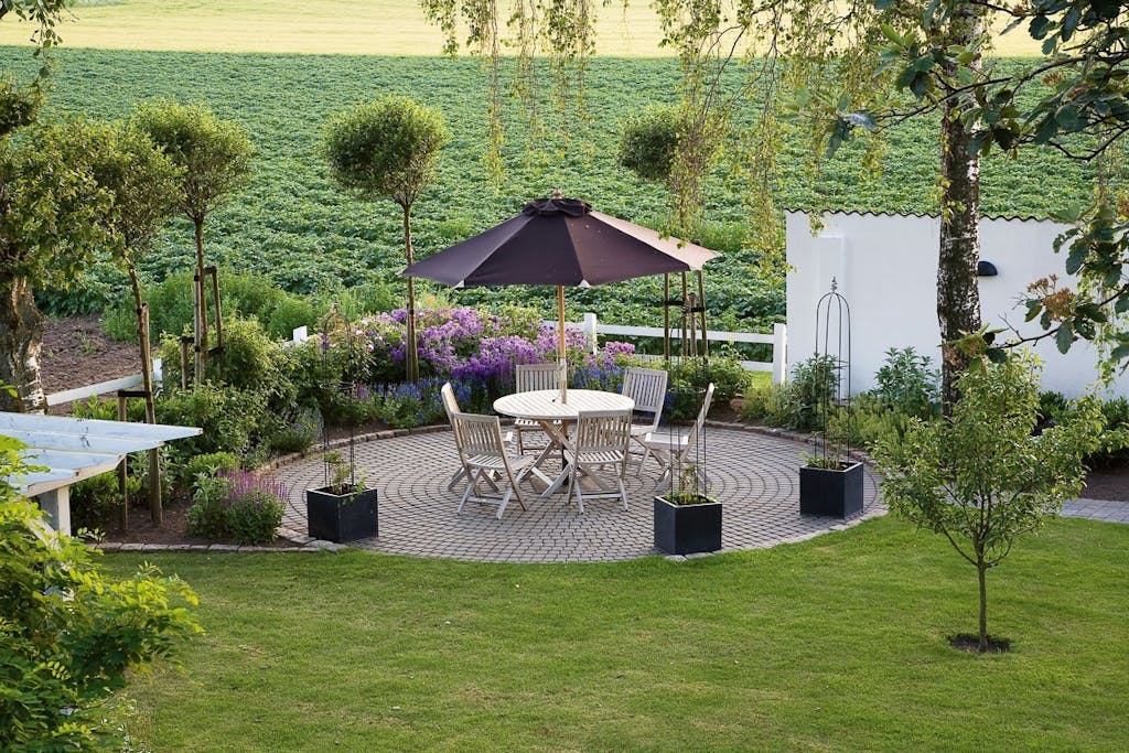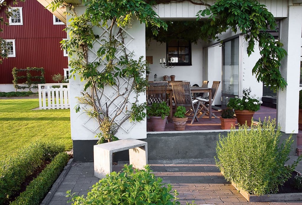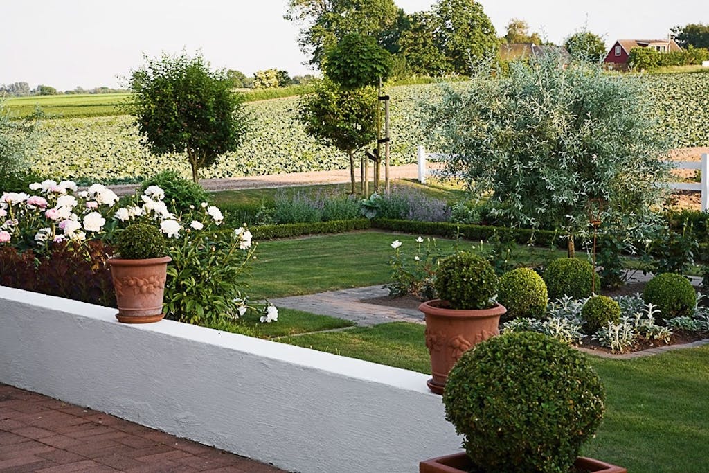 En italiensk terrasse, en hyggelig udestue og et eksklusivt drivhus er fikspunkterne i denne nye have på landet i Skåne.