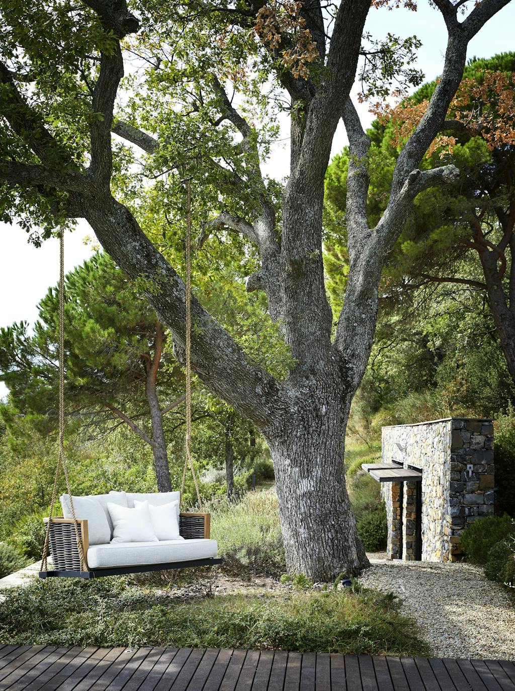 Eksempelvis er den elegante hængesofa under grundens største træ perfekt til en afslappende stund i skyggen. Det samme gælder den lille overdækkede terrasse, hvor et stort udetæppe skaber en tydelig base for de bløde loungemøbler fra Slettvolls Cape-serie og giver en følelse af en rolig oase, hvor samvær og luksus er i højsædet.